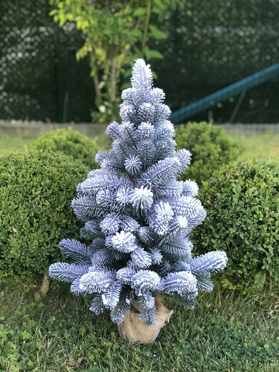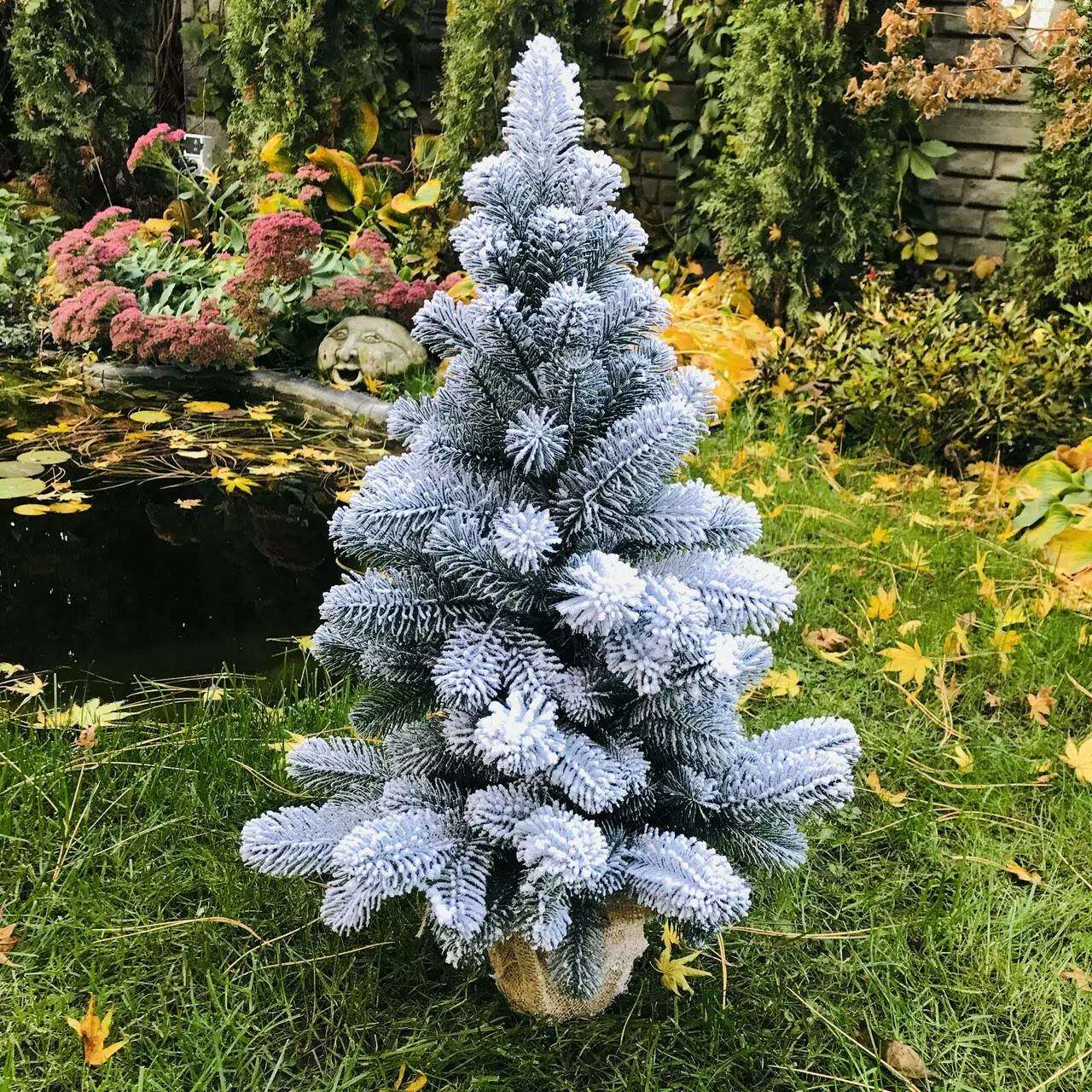 Компактна штучна лита ялинка виглядає ошатно навіть без додаткових прикрас. Всі голочки - литі, точна 3D імітація хвої живої ялинки. Встановлена у горщик, прикрашений мішковиною, з обважнювачем всередині - для захисту від перекидання. Об'ємне густе напилення на ялинці реалістично імітує сніг, який тільки що впав на гілки пухнастими пластівцями. Матеріалом розпилення є натуральна бавовна, він екологічний і не має запаху, безпечний для дітей і дорослих.