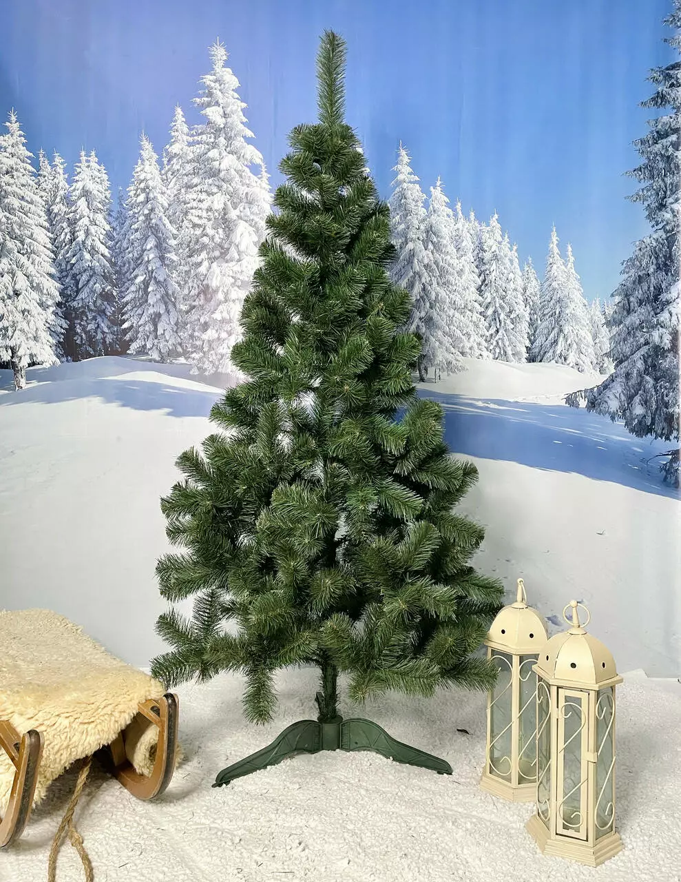 Штучна новорічна ялинка звичайна - чудовий і не дорогий варіант для святкування Різдва та Нового року. Виготовлена з якісної плівки ПВХ, має природний зелений колір гілочок. Ялинка складається з двох частин. Її легко встановити за допомогою стійкої пластикової підставки. Висота ялинки з підставкою - 180 см.