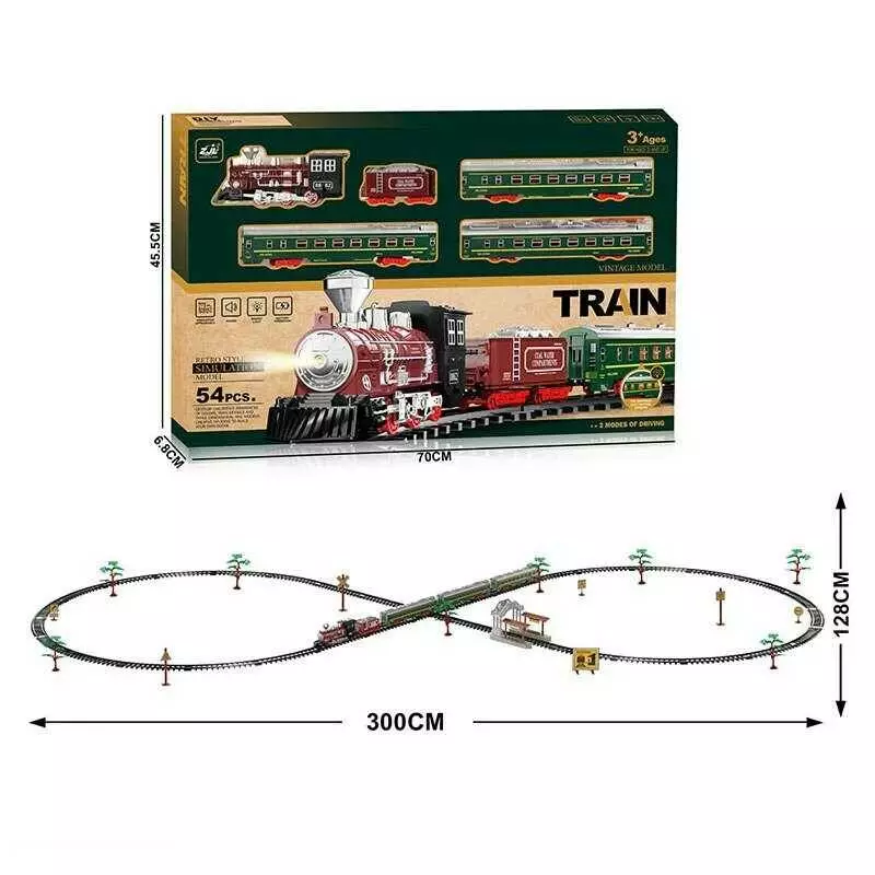 Залізниця 9299-66 (12) 54 ел., 5 вагонів довжиною 114 см, дорога 300х128 см, підсвічування, звук-беззвуч. режим, рух вперед, на батарейках, в коробці