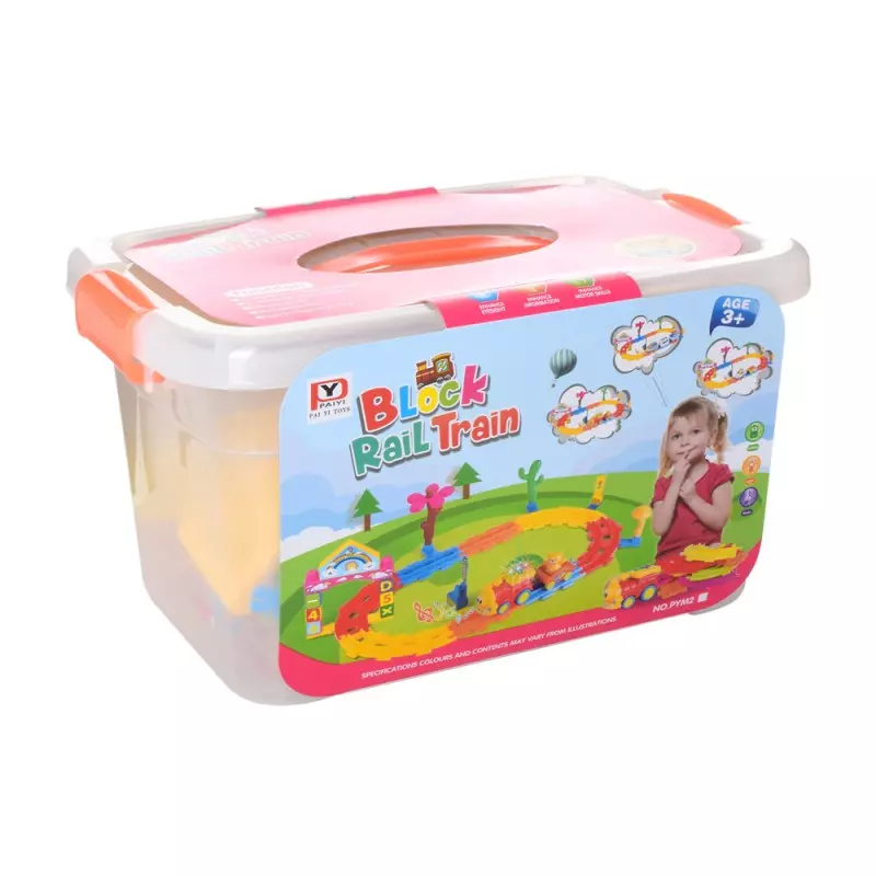 Фотография 1 товарной позиции интернет-магазина детских игрушек www.smarttoys.com.ua Залізниця PYM22 локомотив,вагон,фігурка-неваляшка,33дет.,муз.,світло,бат.,валіза,картон.,35-19-24см.