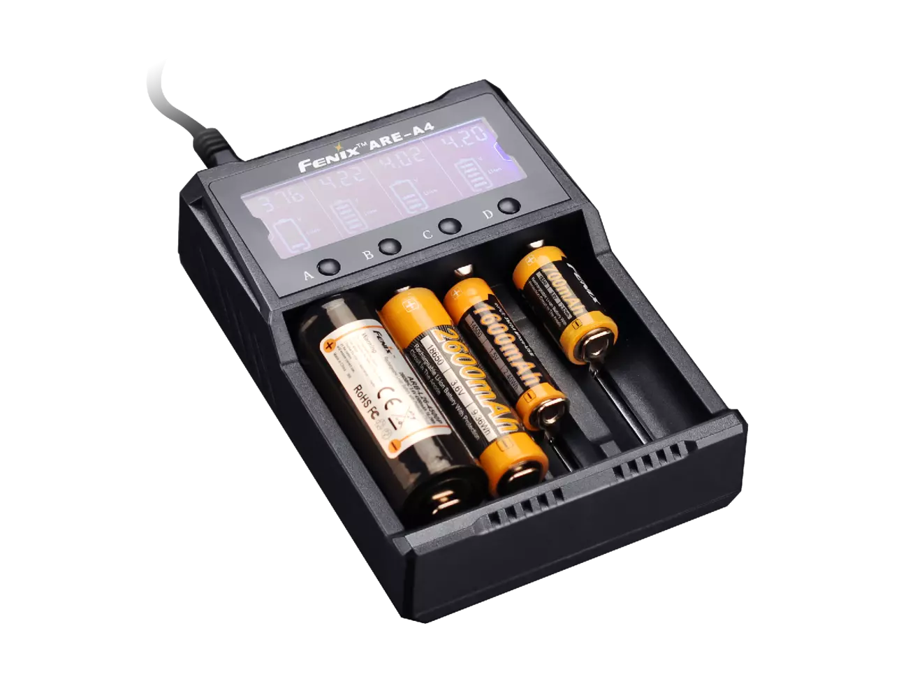 Fenix ARE-A4 являє собою дійсно універсальний зарядний пристрій, який може працювати практично де завгодно і майже з будь-якими видами акумуляторів. Для нього допустима установка елементів живлення 9 різних форматів. Це 6 різновидів літій-іонних елементів живлення (18650, 14500, 26650, 10440, 21700, 16340) і ще 3 типу нікель-кадмієвих або нікель-металгідридних (АА, ААА, С). Прямо з коробки пристрій готовий до підключення до центральної електромережі. А щоб використовувати його в автомобілі, потрібно придбати окремий кабель. При його наявності, Fenix ARE-A4 підходить для будь-яких автоподорожей. До того ж, вага даної моделі дорівнює всього 265 м, що робить її відмінним варіантом спорядження для мандрівників.