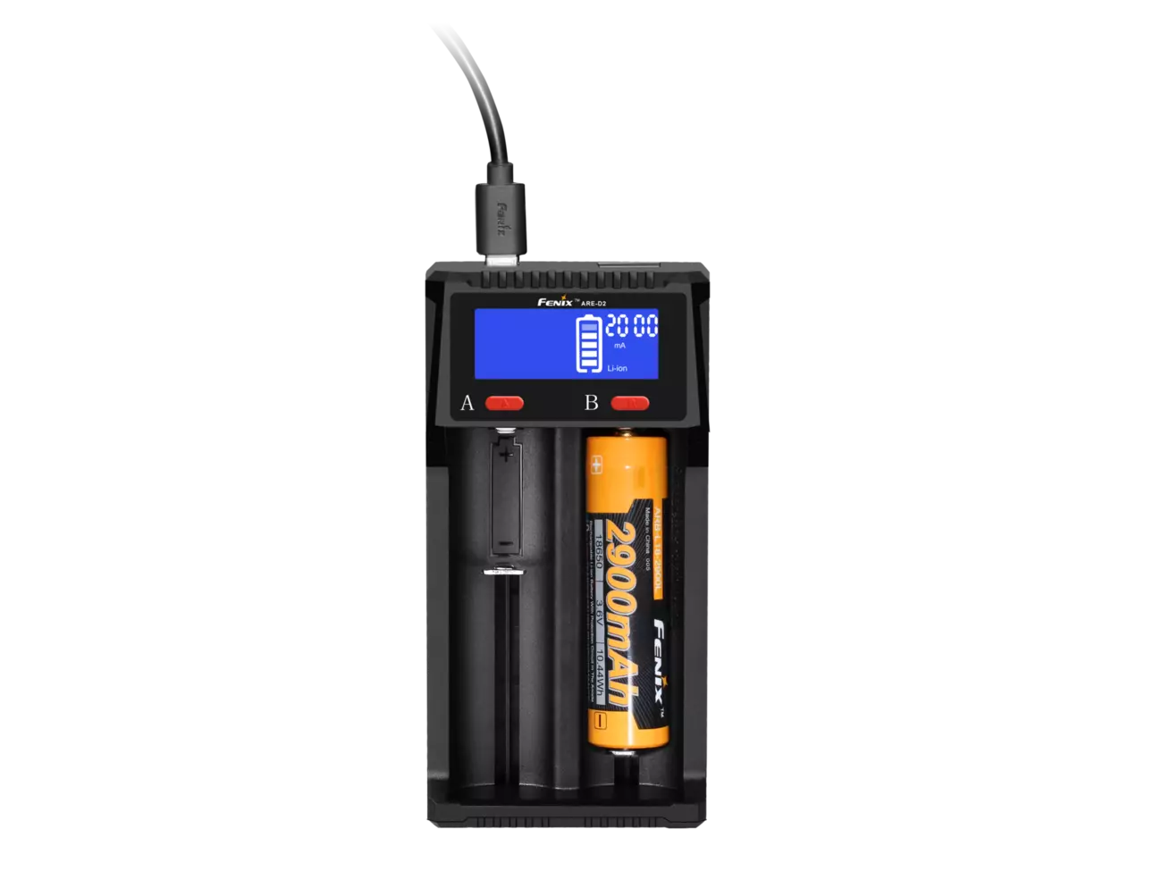 Щоб зарядити акумулятор, потрібно встановити його в слот для зарядного пристрою, а потім - підключити до мережі. Fenix ARE-D2 самостійно ідентифікує елемент живлення і обере для нього оптимальну програму. Тим не менш, у користувача зберігається можливість вручну вибрати потрібний варіант сили струму. Для акумуляторів з літієвим електролітом є 3 варіанти: 0,5 А, 1А, 2А. Для елементів живлення на основі нікелю варіантів 2: 0,5 А і 1А. Функція вибору сили струму буде доступною протягом 8 секунд після включення Fenix ARE-D2.