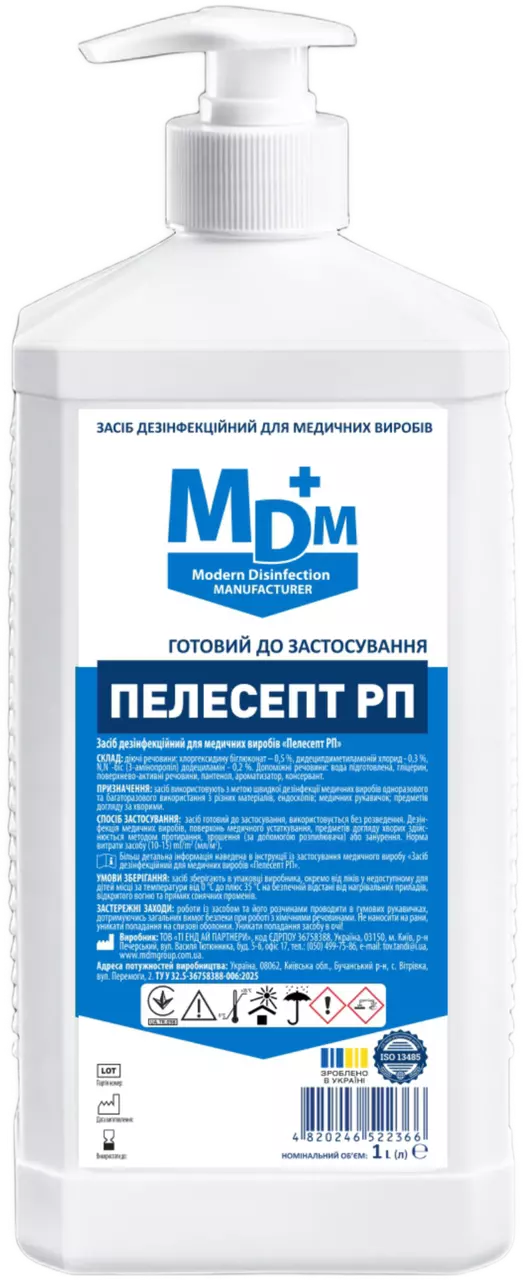 Засіб дезінфекційний для медичних виробів Пелесепт РП - готовий до застосування дезінфекційний засіб у вигляді прозорої безбарвної або забарвленої рідини із запахом використаної сировини або ароматизатора. Має виражені антимікробні, миючі та очищаючі властивості. Добре змочує поверхні, ефективно видаляє забруднення різного походження. Не потребує розведення, зручний у застосуванні, сумісний із широким спектром матеріалів. Призначений для швидкої дезінфекції медичних виробів та медичного обладнання, у тому числі багаторазового використання, включаючи ендоскопи, стоматологічні та хірургічні інструменти, датчики, кувези, медичні рукавички, предмети догляду за хворими тощо.