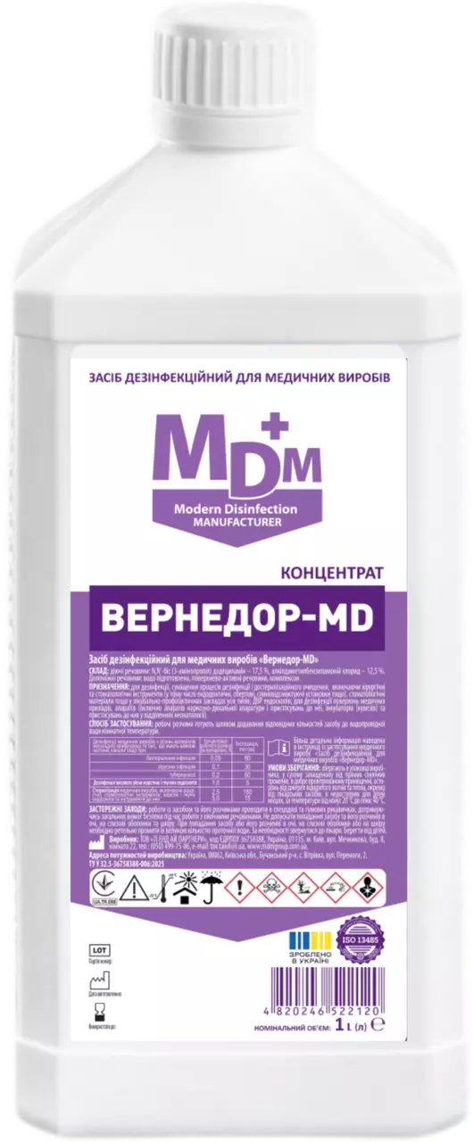 Засіб дезінфекційний для медичних виробів Вернедор-MD - концентрований засіб із широким спектром антимікробної дії. Добре розчиняється у воді, має виражені бактерицидні, віруліцидні, фунгіцидні, спороцидні властивості та ефективний проти збудників внутрішньолікарняних інфекцій, туберкульозу, гепатитів, ВІЛ, грибкових інфекцій.Не пошкоджує поверхні з металу, скла, гуми, пластику, полімерів, дерева, силікону. Не фіксує білкових забруднень, не залишає слідів і плям, добре змивається. Видаляє білкові, жирові, механічні забруднення, залишки крові та медикаментів.