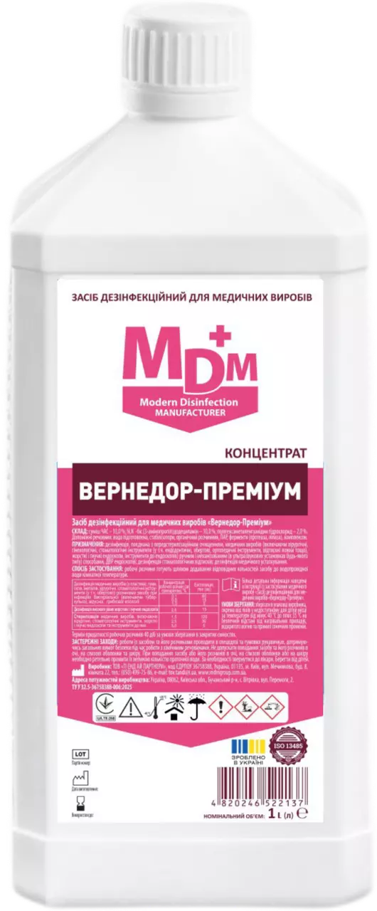 Засіб дезінфекційний для медичних виробів Вернедор-Преміум - високоефективний концентрований засіб нового покоління, призначений для повного циклу обробки медичних виробів: від очищення до стерилізації. Завдяки комбінації трьох антимікробних компонентів та ферментів, засіб забезпечує глибоке знезараження навіть у складних умовах.Ефективний проти широкого спектра патогенів, включаючи спорові форми, туберкульоз, віруси гепатиту, ВІЛ, грибки. Має розширену антисептичну дію, не фіксує білкові забруднення, не залишає слідів та не пошкоджує медичні інструменти.Оптимальне рішення для медзакладів, які вимагають максимальної ефективності та безпеки.