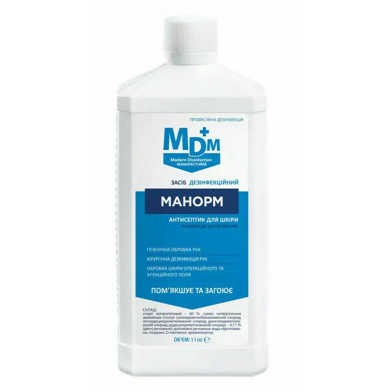 Засіб дезінфекційний Манорм — високоефективний дезінфекційний засіб на основі 60% ізопропілового спирту та комплексу четвертинних амонієвих сполук. Призначений для гігієнічної та хірургічної обробки рук, антисептичної обробки шкіри перед ін’єкціями, операціями, а також для профілактики грибкових захворювань стоп. Засіб має пролонговану антимікробну дію до 3 годин, не пересушує шкіру, не залишає липкого шару, не потребує змивання та сумісний із шкірою навіть при багаторазовому використанні.