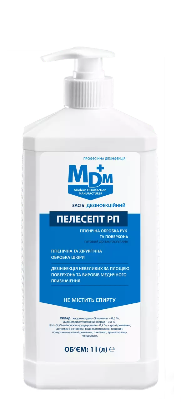 Пелесепт РП — готовий до застосування антисептичний засіб широкого спектра дії. Призначений для гігієнічної та хірургічної обробки рук, антисептичної обробки шкіри перед ін’єкціями, хірургічними втручаннями, а також для профілактики грибкових захворювань стоп. Засіб підходить для швидкої дезінфекції поверхонь, медичних інструментів, рукавичок, ендоскопів та іншого обладнання. Містить зволожуючі компоненти, не пересушує шкіру, не залишає липкого шару та забезпечує пролонговану антимікробну дію до 3 годин.