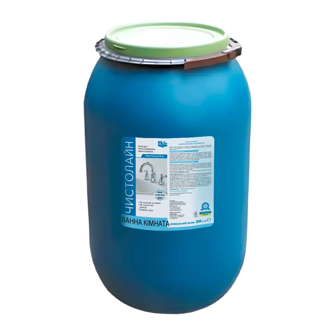 Засіб миючий Чистолайн "Ванна кімната" 200 л (бочка) – високоефективний засіб, який має виражені миючі властивості та антимікробну дію. Призначений для очищення різноманітних поверхонь у ванній кімнаті: раковин, ванн, душових кабін, унітазів, керамічної плитки, кранів, змішувачів та інших сантехнічних виробів. Ефективно видаляє накип, іржу, вапняний наліт, залишки мила, зубної пасти та сечовий камінь. Завдяки спеціальній формулі, засіб не пошкоджує хромовані, керамічні, акрилові, порцелянові, скляні поверхні, а також вироби з нержавіючої сталі та полімерних матеріалів. Продукт не фіксує органічні та неорганічні забруднення і легко змивається, не залишаючи слідів.