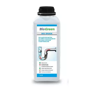 Засіб Biogreen Bio Shock – застосовується для видалення комбінованих забруднень в стоках каналізаційних систем септиків та вигрібних ям. Видаляє засори органічного характеру (жир, білок і т.п.) з твердих поверхонь, виготовлених з нержавіючої сталі, кераміки, пластмас, то що. Використовуються в комплексі з засобами для очистки септиків та вигрібних ям Biogreen Bio Shock.