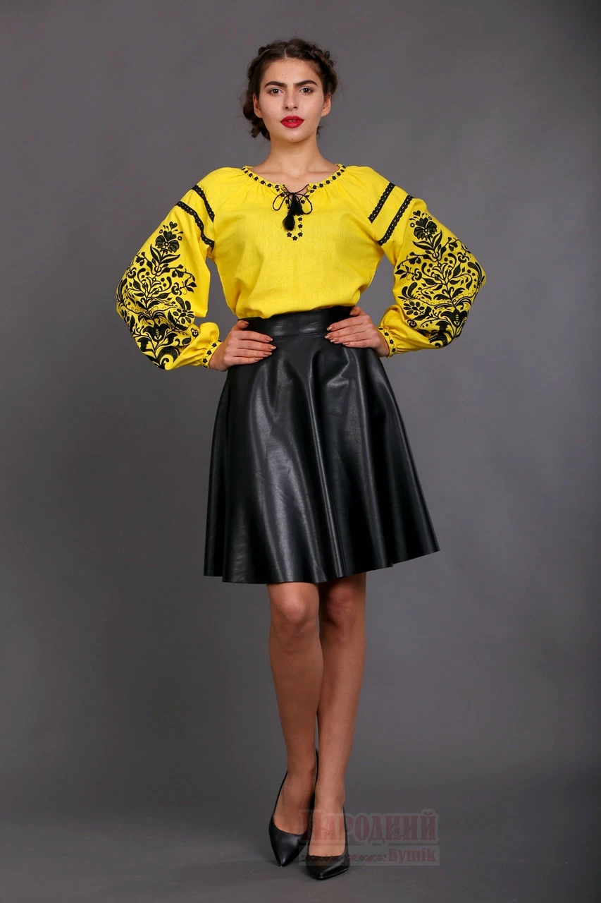 Красивая женская вышиванка из желтого льна с узором "дерево жизни" - украсит ваш гардероб. Яркая желтая ткань вышита шелковистыми черными нитками. Узор гладью украшает пышные рукава изделия и смотрится объемно и богато. Вышивку на рукавах дополняет ажурное черное кружево. Орнамент "Дерево жизни" символизирует мировую взаимосвязь и долгую жизнь. Желтую вышиванку Дерево жизни можно отлично сочетать с современными вещами.