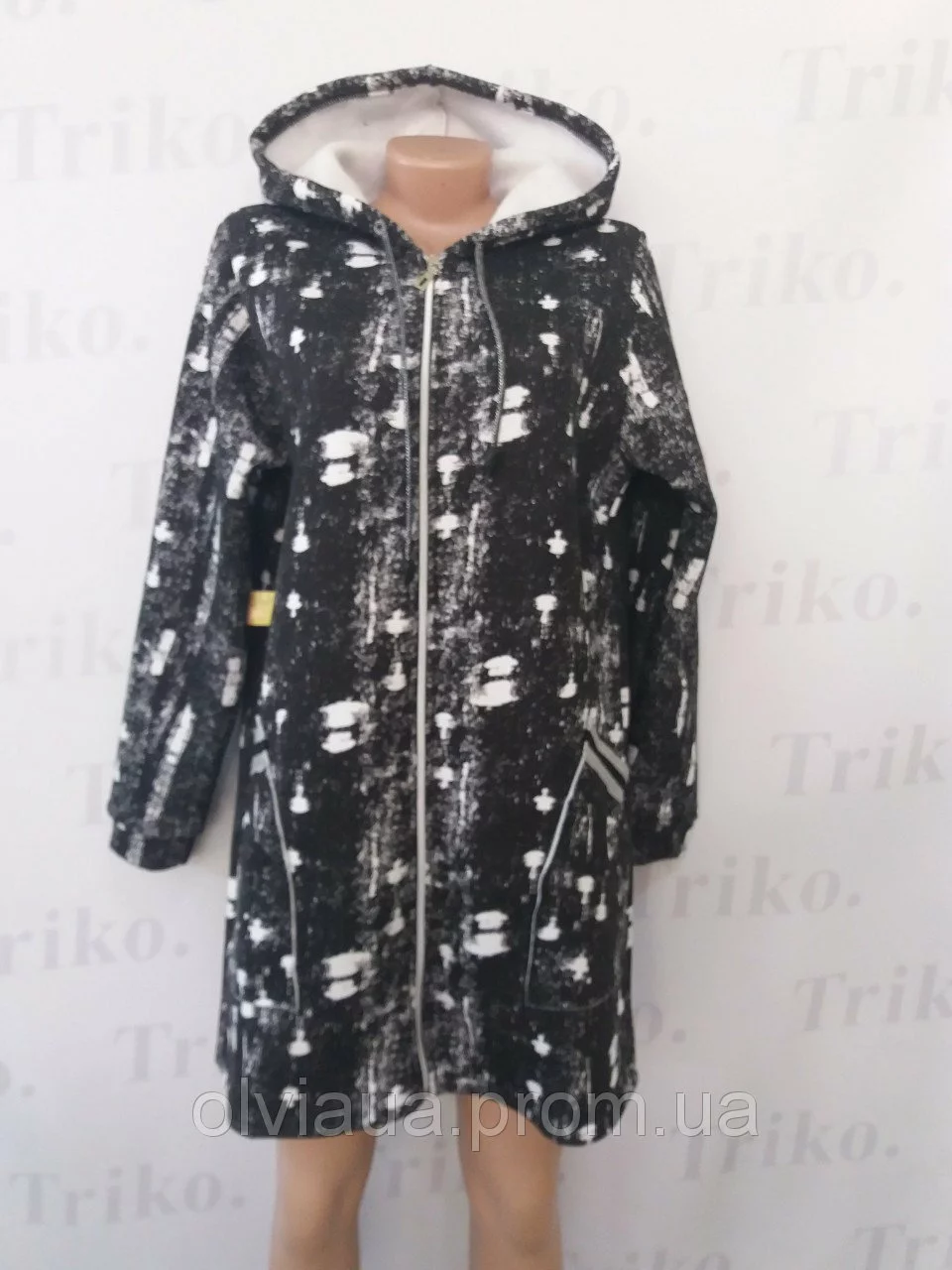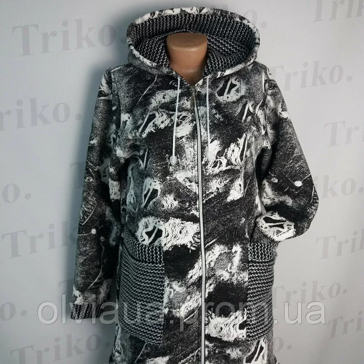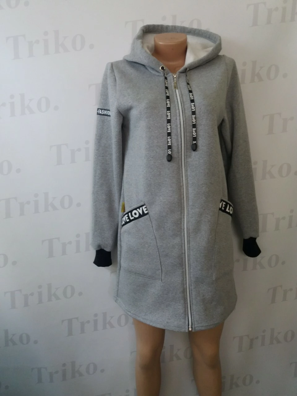 Кардиган на флисе : с капюшоном,накладными  карманами  , на молнии . Размер: 44,46,48,50,52,54. Полотно : трёхнитка на флисе .