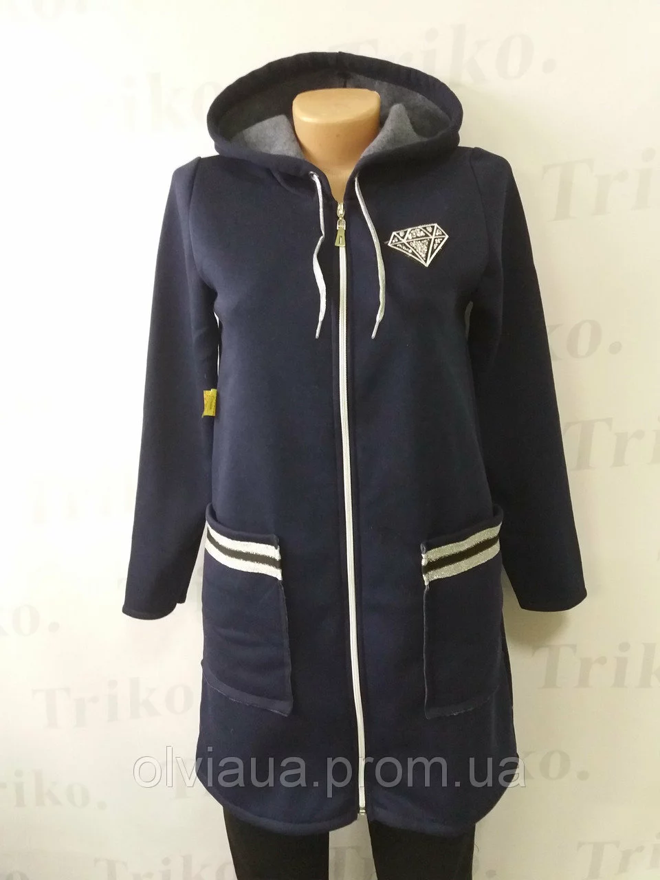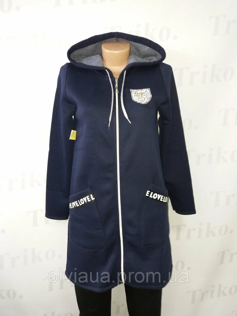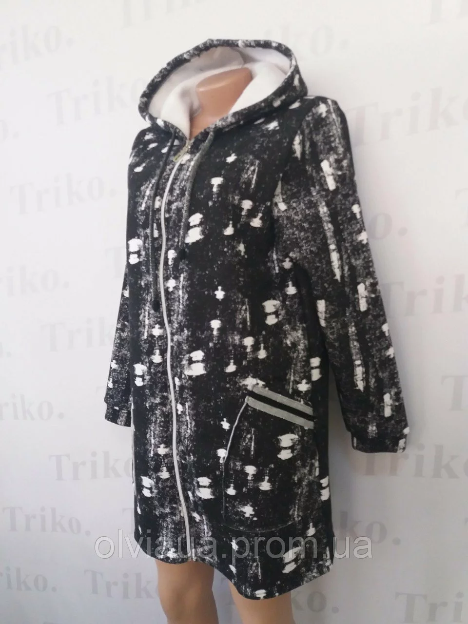 Кардиган на флисе : с капюшоном,накладными  карманами  , на молнии . Размер: 44,46,48,50,52,54. Полотно : трёхнитка на флисе .