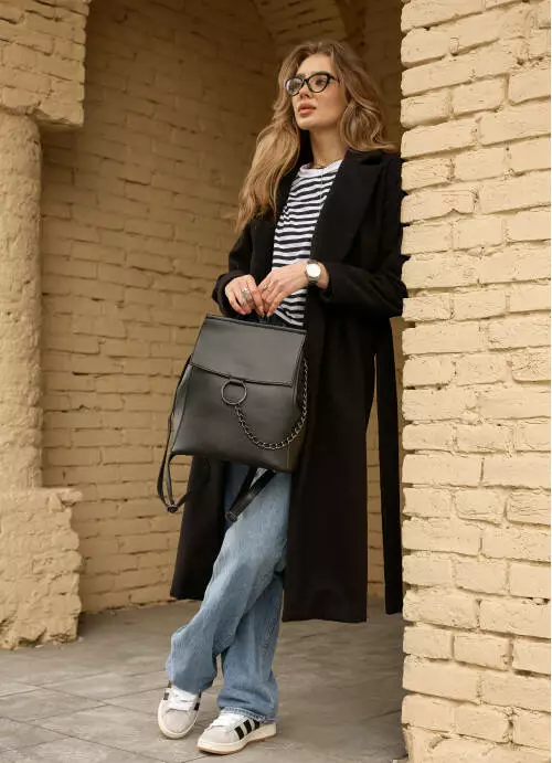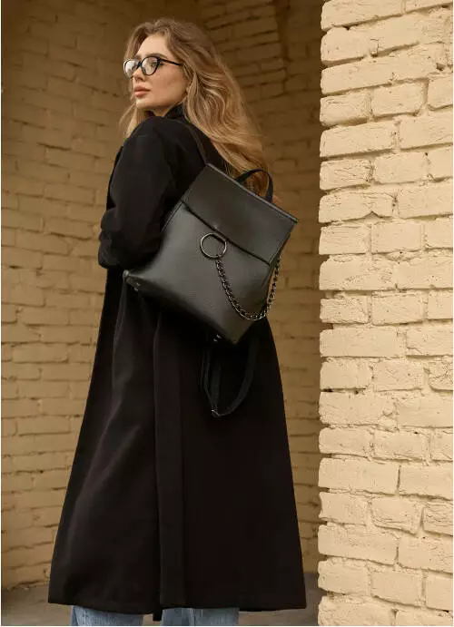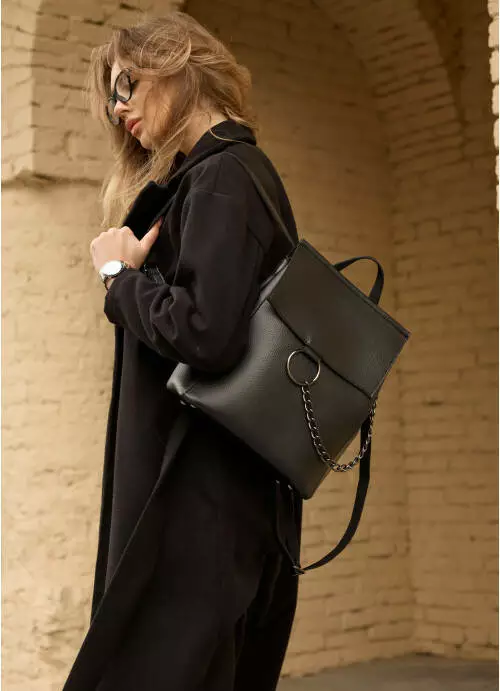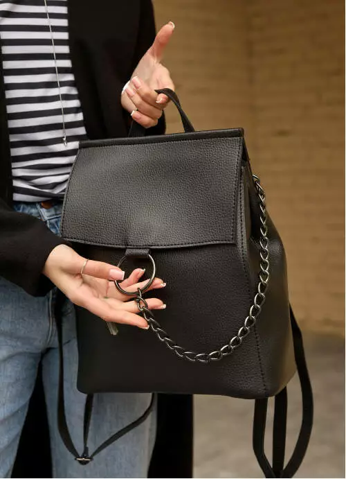 Выполненный из экокожи, клапан рюкзака украшен фурнитурой в виде кольца с цепочкой. Основное отделение закрывается молнией.