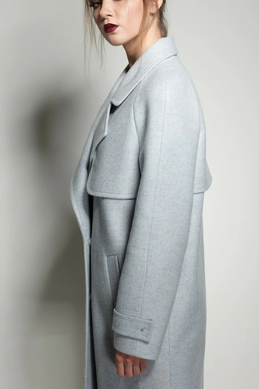 объёма с патом по низу. Воротник отложной с большими лацканами.