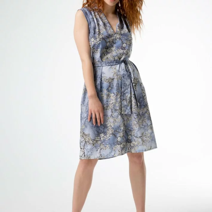 Сукня з незвичайною горловиною-миском, виконана з прінтованої