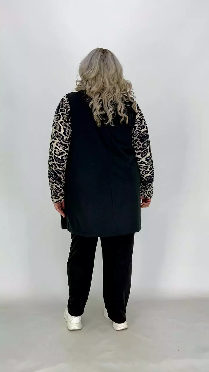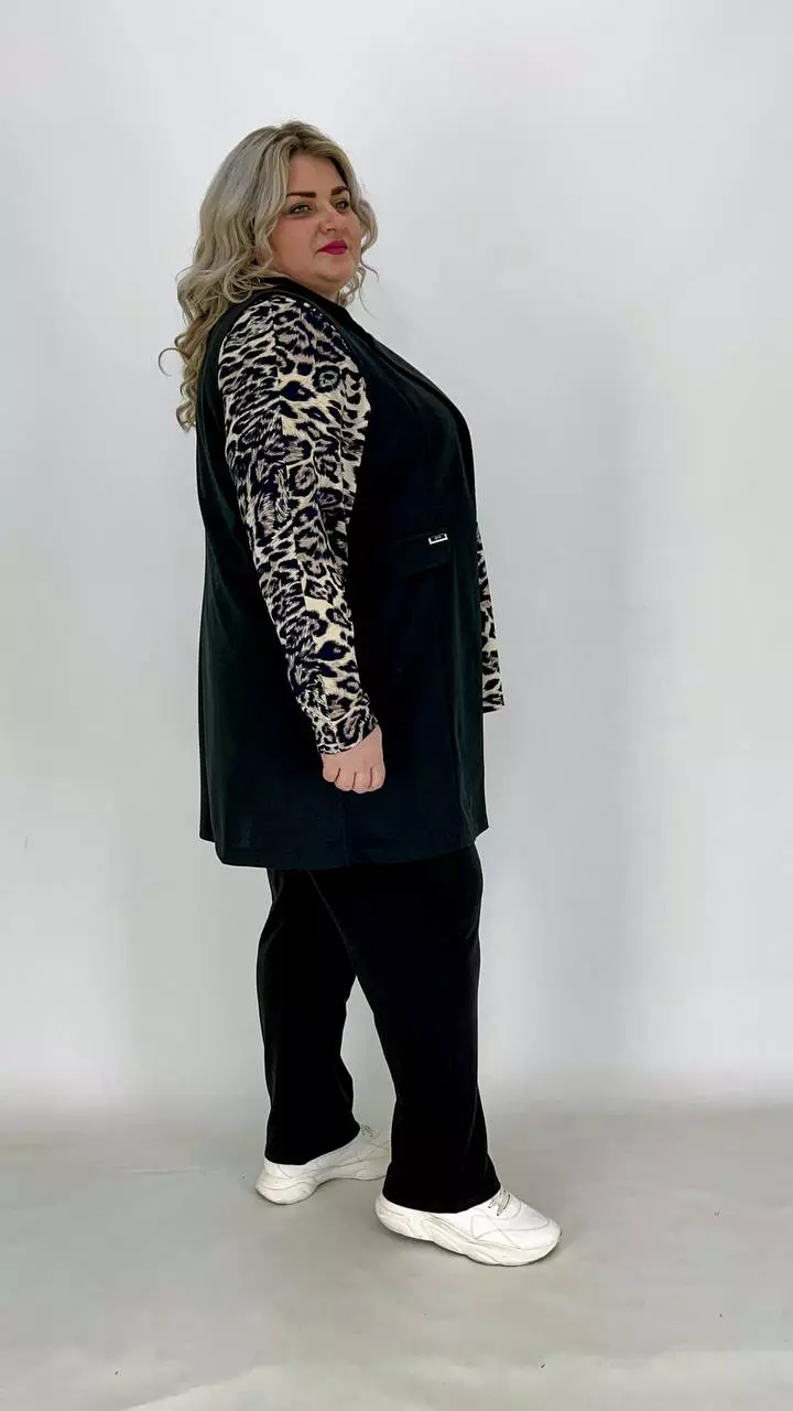 Тканина-італійська трикотаж середньої розтяжності, добре тримає форму. Піджачний крій, напівприлеглий силует, без кишень, без застібок. Відстань між підлогами жилета, зорово подовжує силует.