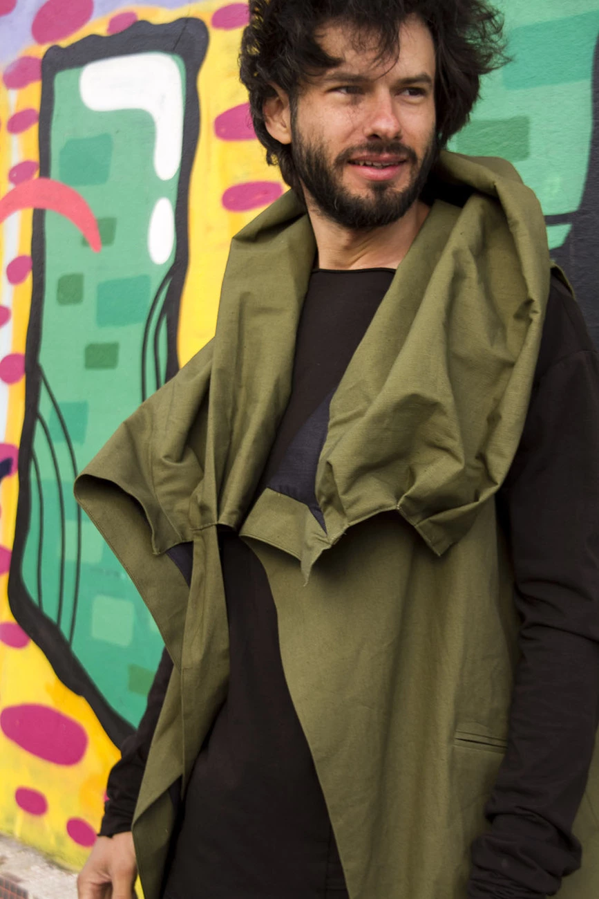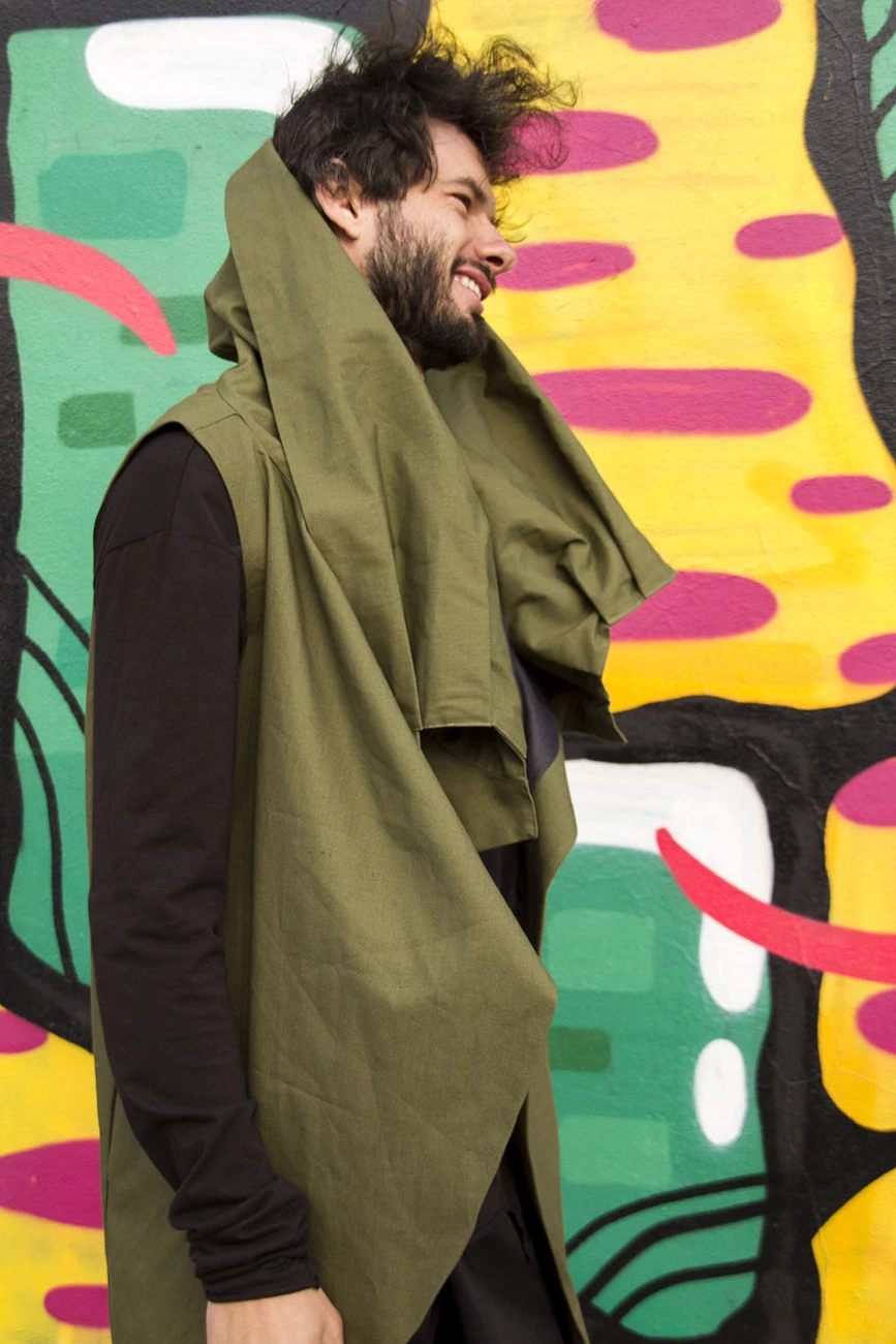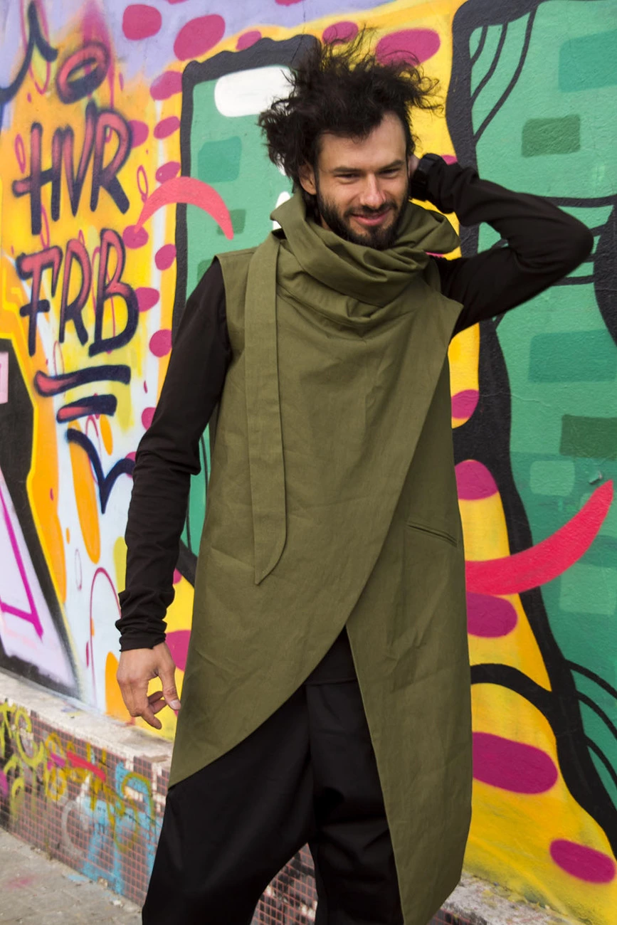 Удлиненная асимметричная модель без застежки, карманы в боковых швах, объемный воротник-капюшон фиксируется лентой.