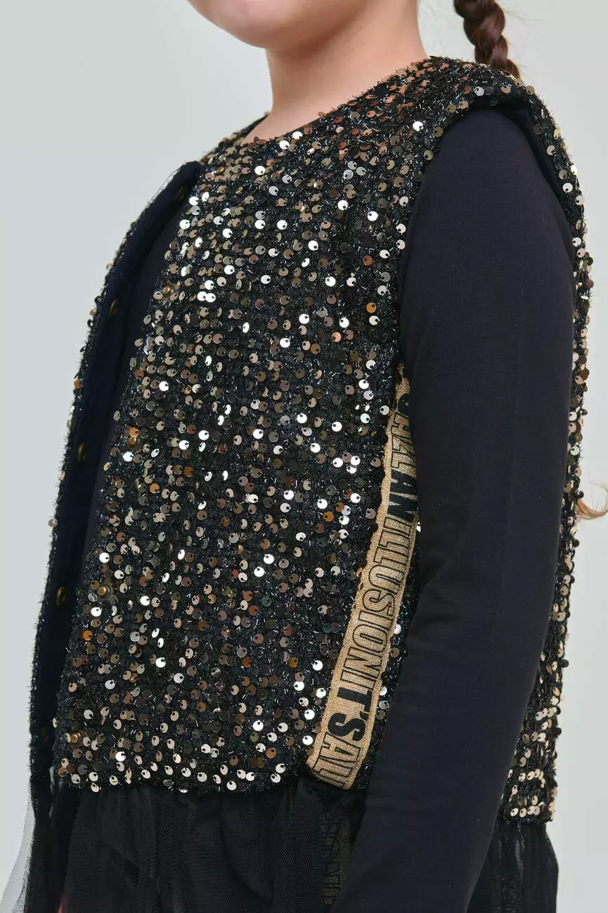 Деталі: безрукавка чорного кольору. Кругла горловина без коміра. Лампаси та паєтки золотого кольору. Застібка – кнопки. Внизу прикрашена фатиновими рюшами. Прямий крій. Розмірний ряд: від 104 см до 164 см
