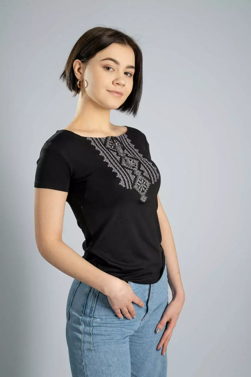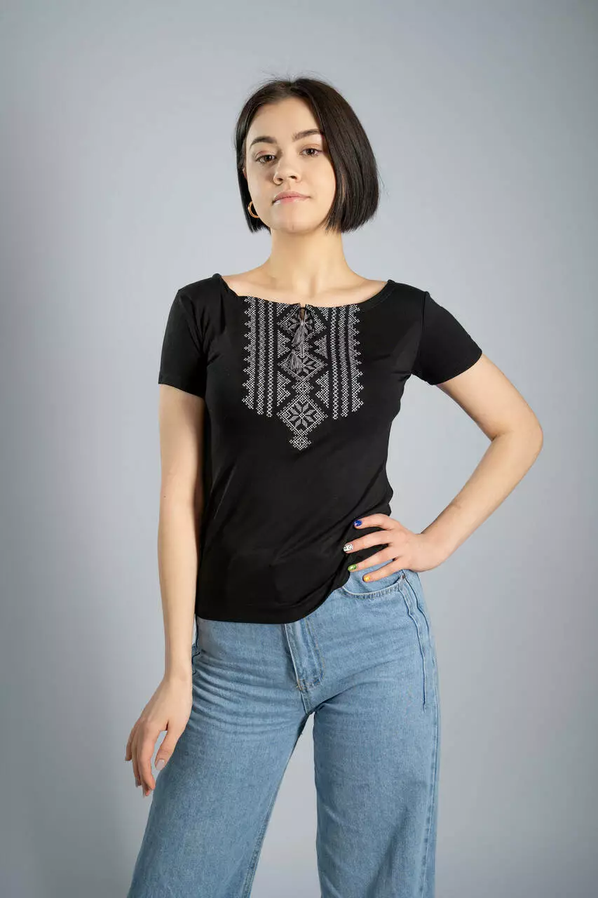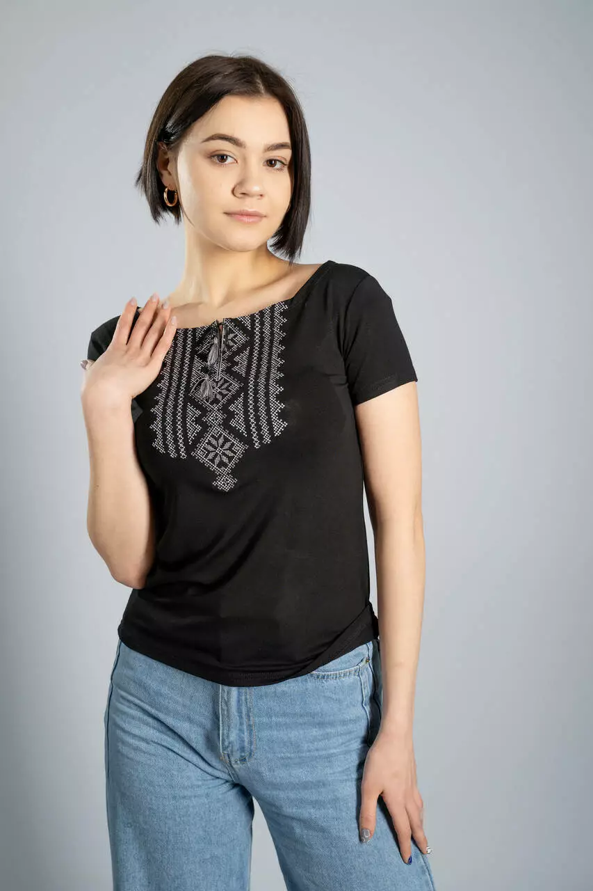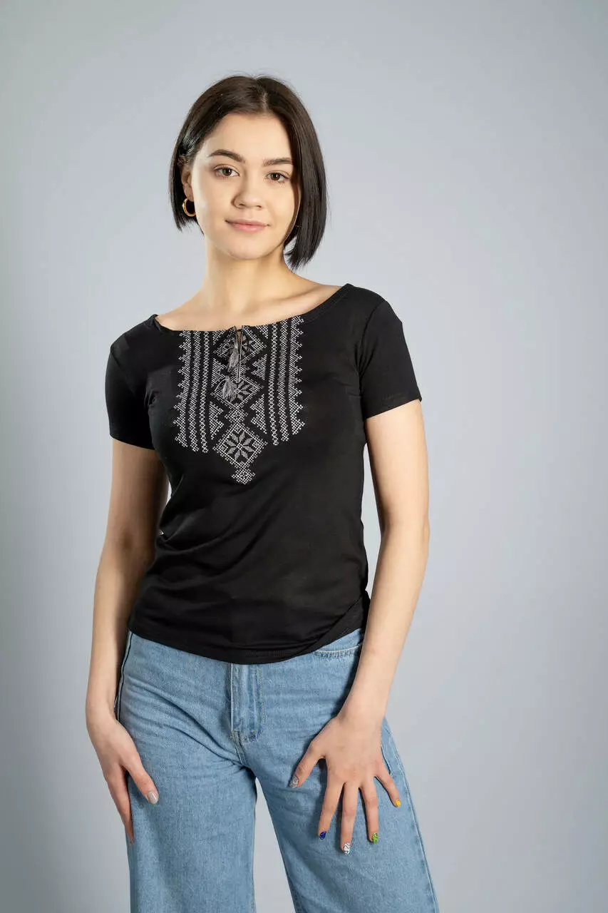 Дуже стильна та чорна жіночна вишита футболка на короткий рукав “Гуцулка” приваблює вже з першого погляду. ЇЇ ніжна та приємна до тіла тканина чудово підкреслює Ваші контури та акцентує увагу на головних перевагах Вашої стрункої фігури. До складу тканини входить високоякісна віскоза та еластан у потрібних пропорціях. Тканина чорного кольору, яка не вигоряє та не тьмяніє після прання.