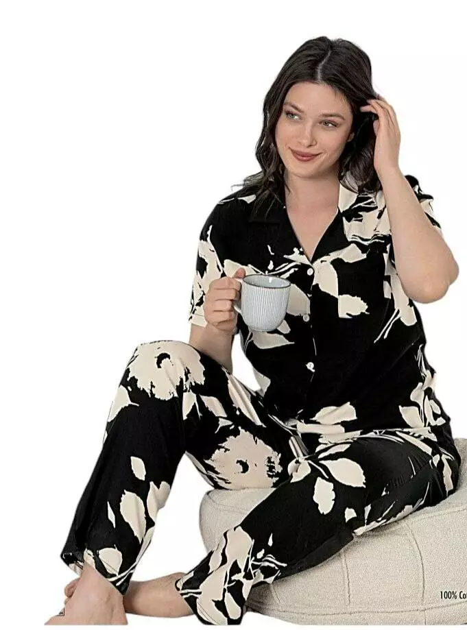 Стильна жіноча піжама з квітковим принтом. Комплект складається з сорочки з комірцем на гудзиках та штанів вільного крою на резинці. 100% котон