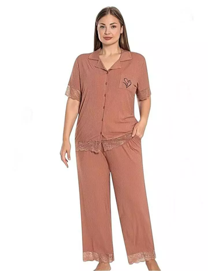 Зручна піжама для жінок від бренду Cotpark. Комплект складається з однотонної сорочки з комірцем,оздобленою на рукавах та низом мереживом та штанів вільного крою оздоблених знизу мереживом. Ідеальний вибір для затишного відпочинку вдома та комфортного сну.