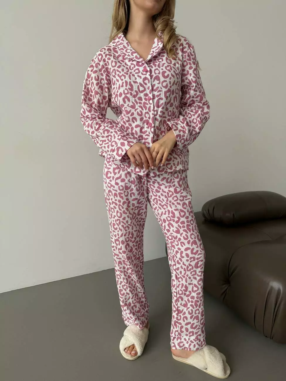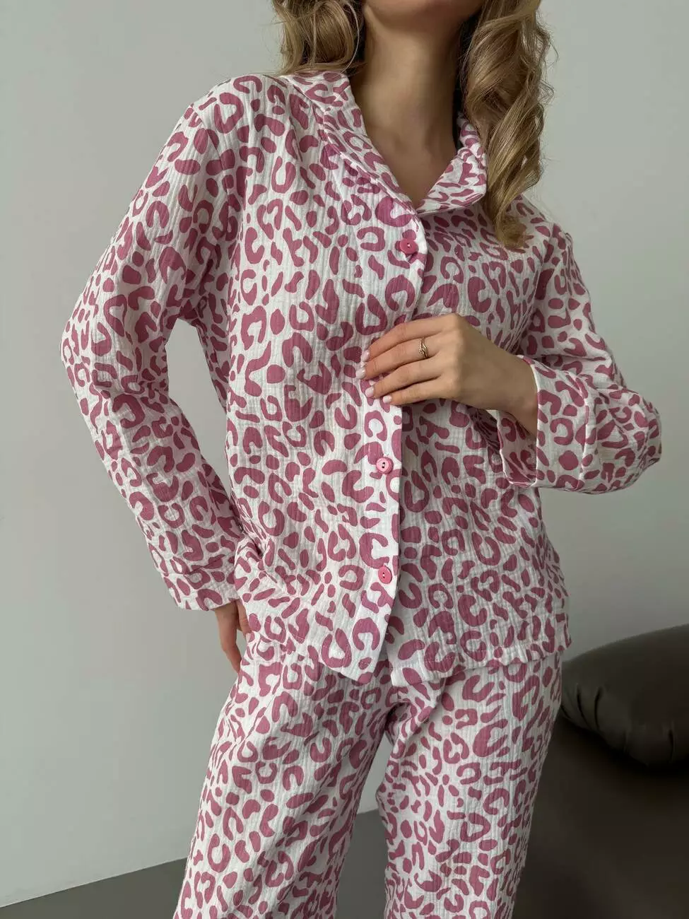 Муслінова піжама для жінок у трендовому кольорі весни Pantone Crocus з леопардовим принтом. Ніжний відтінок пурпурового з нотками елегантності поєднується з грайливим леопардовим принтом, створюючи унікальний баланс стилю й гармонії.