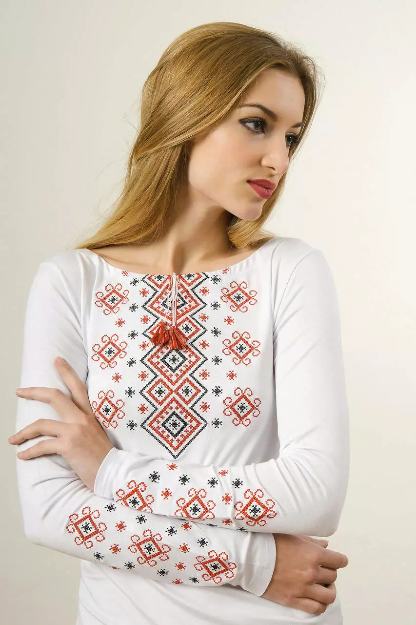 Особливістю цієї моделі є пишна вишита стійка, яка розташована на переді вишиванки. Унікальний карпатський орнамент, виконаний червоними та чорними нитками, гармонійно виглядає на контрастній білій тканині. Вишитим геометричним візерунком прикрашені рукави цієї моделі. Загалом розташування візерунків створює довершену композицію, яка нічим не гірша за будь-яку квіткову.