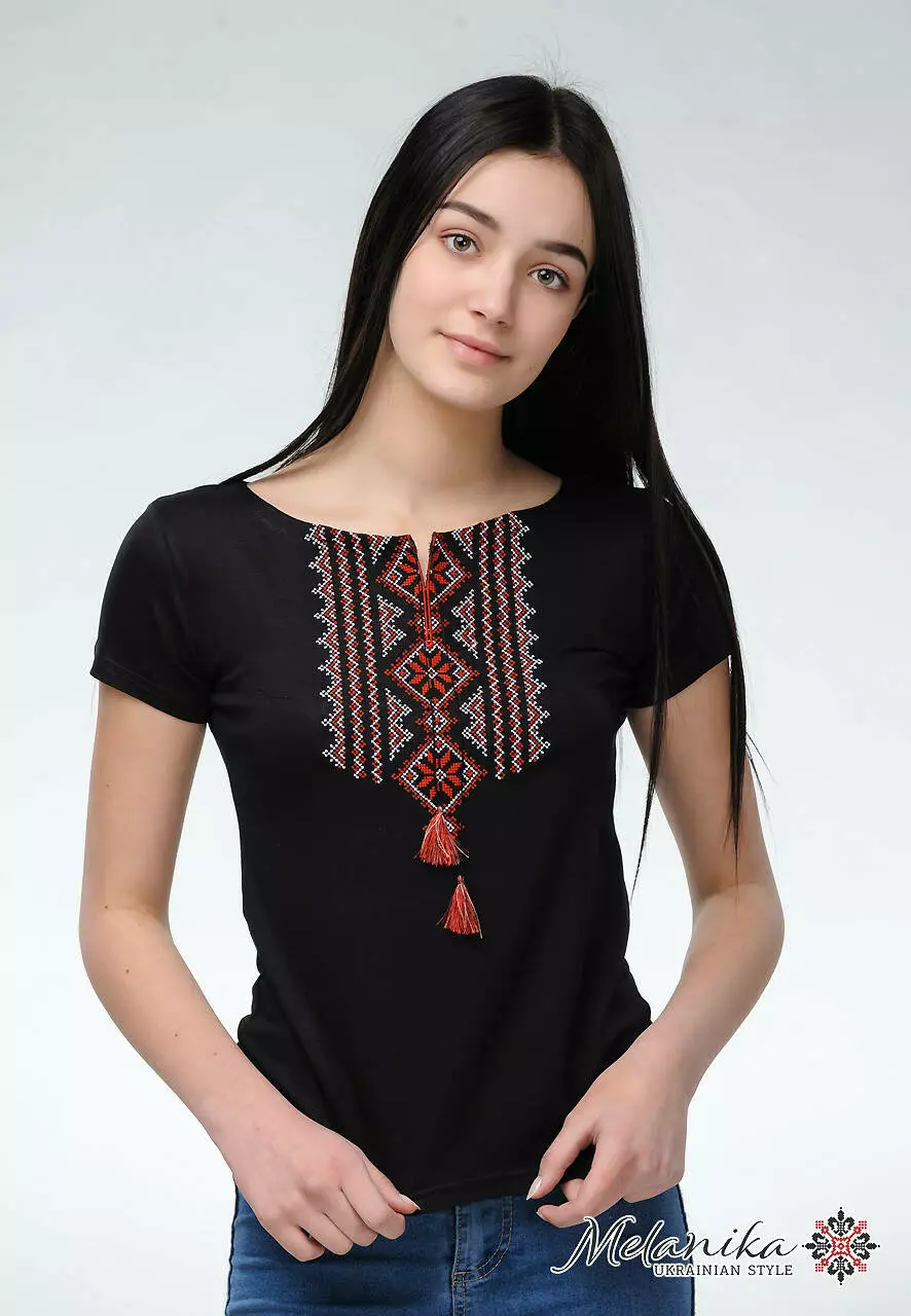 Ця чорна жіноча вишита футболка по-справжньому особлива. Навіть неможливо переоцінити нереальну красу натурального гуцульського орнаменту. Геометрична композиція виконана хрестиком. Нитки вдало підібрані. Червоні яскраві візерунки домінують на чорній основній тканині. Вишивка виконана технікою машинної вишивки. Будьте певні, що кожен стібок надійний та не розійдеться після прання.