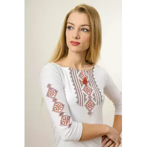 Жіноча вишита футболка з рукавом 3/4 білого кольору з червоним орнаментом «Гуцулка» S