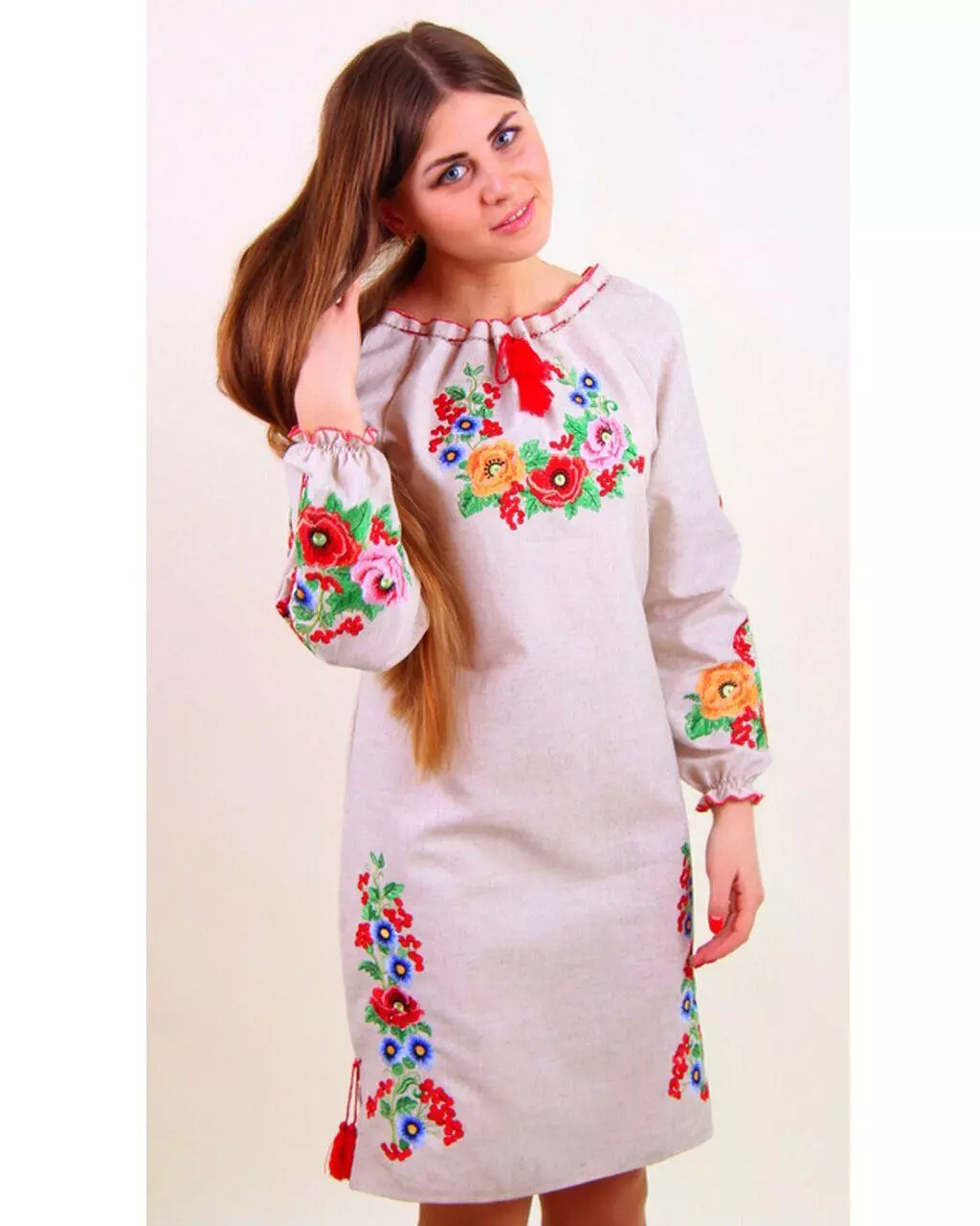 Вишукана вишиванка "Діана" з довгим рукавчиків на гумці. Вишита спеціальними якісними нитками, які призначені забезпечувати яскравість і стійкість вишивки при постійному використанні, а гладьевый візерунок з плавними переходами кольору не залишить байдужою жодну дівчину! Дуже ніжно виглядають разом маки, калина і волошки в соковито-зелених листках!