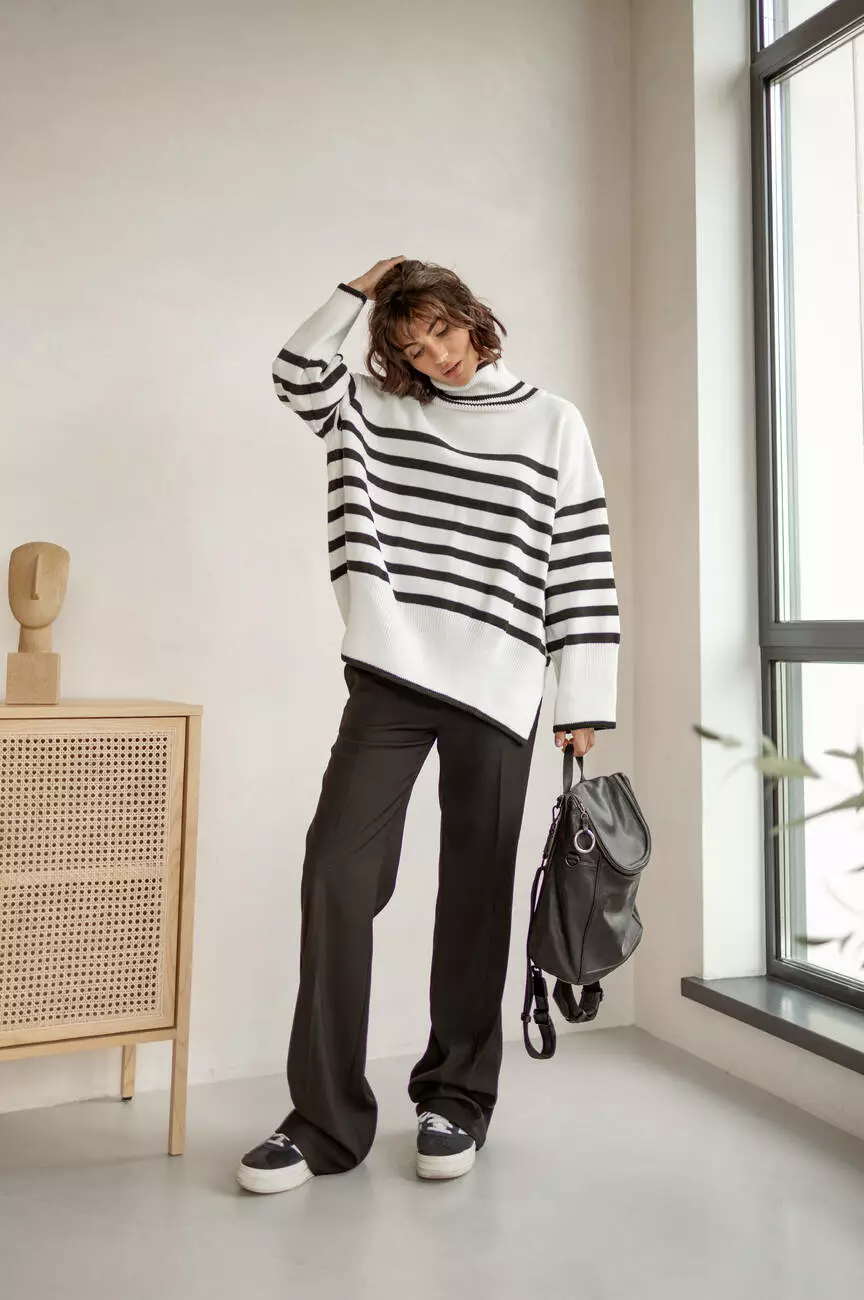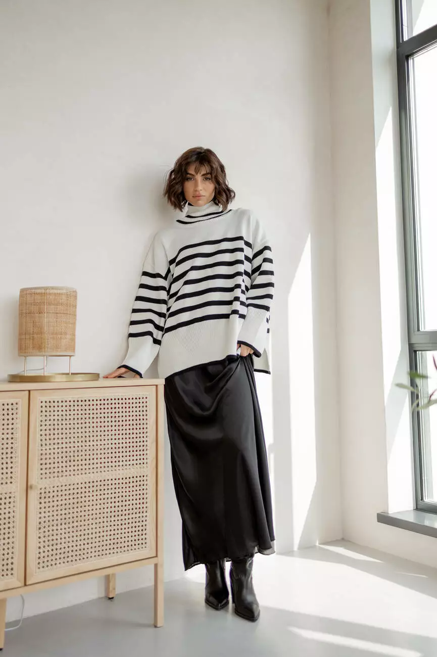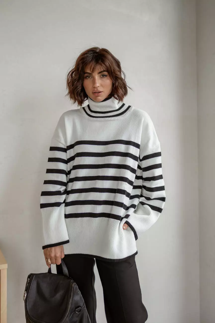 Подовжений светр у смужку має довгі широкі рукави з манжетами, високу горловину та манжет по низу виробу.