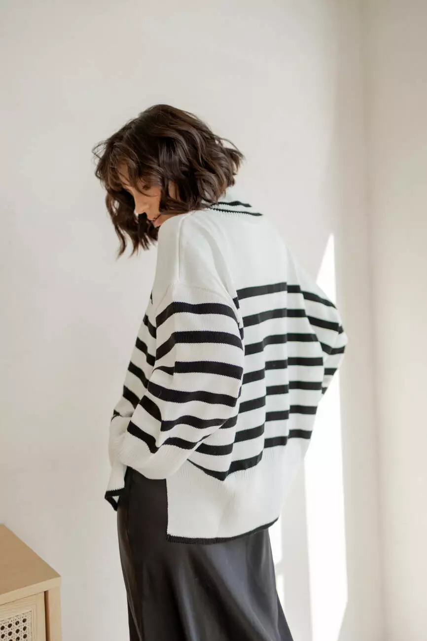 Жіночий бавовняний светр Тільняшка в смужку під горло біло-чорного кольору