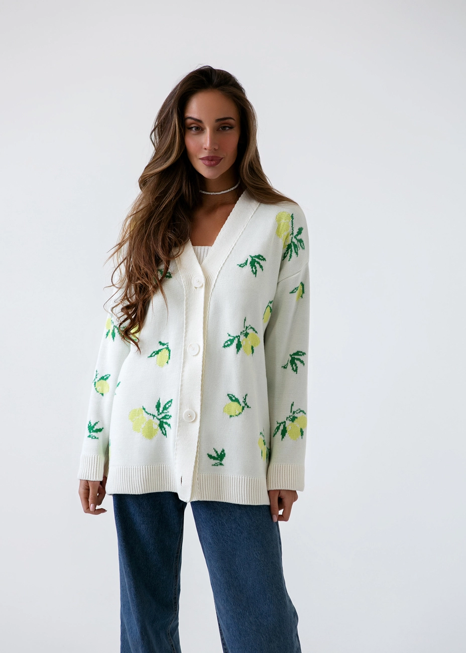 Кардиган із затишного жаккарда з лимонами. Виконаний з