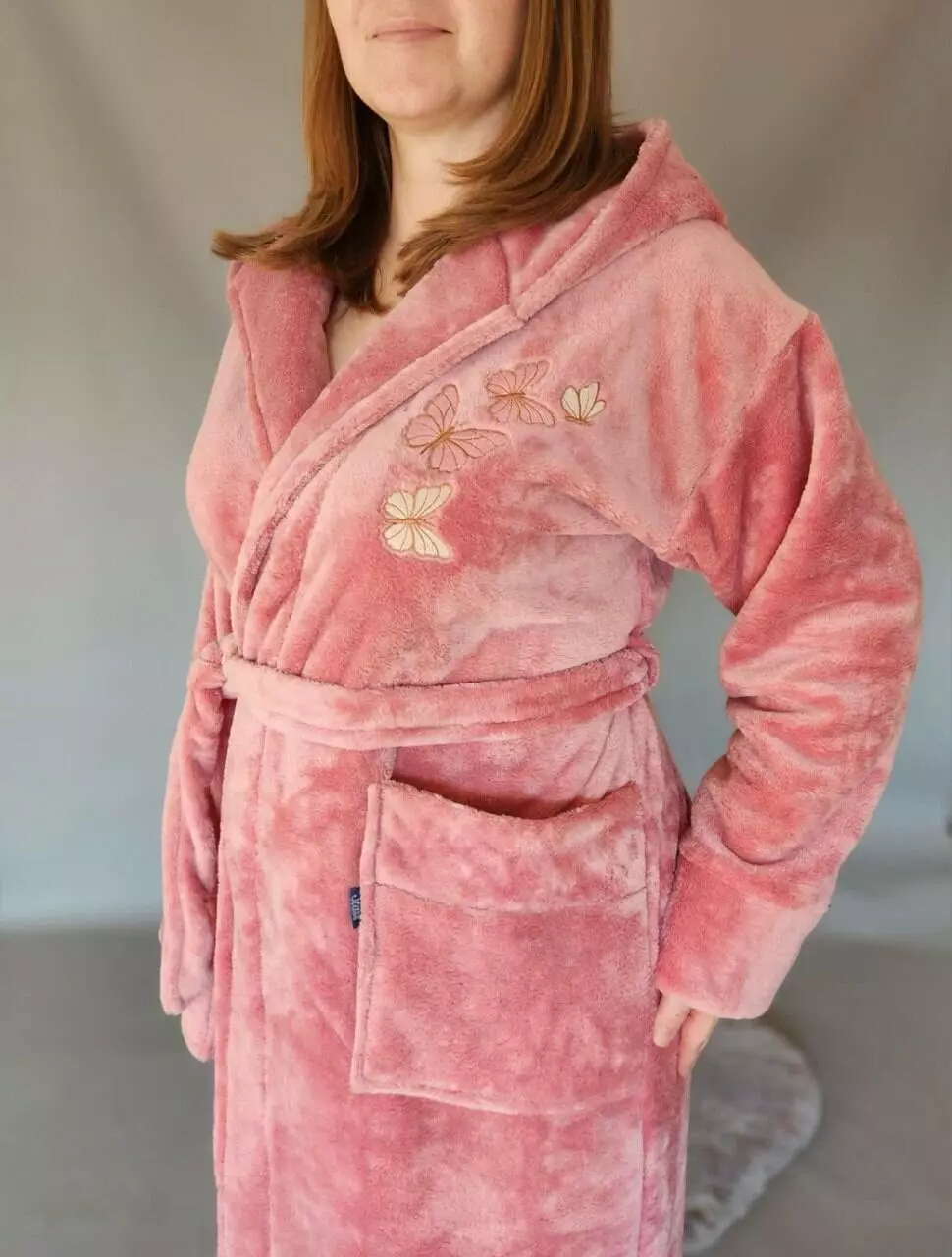 Жіночий махровий халат Golden Comfort — це поєднання вишуканого стилю, м'якості та тепла. Виготовлений з махри ультра софт преміум-якості, та прикрашений вишивкою у вигляді метеликів, він огортає ніжністю та дарує комфорт у прохолодні ранки та затишні вечори. Декоративна вишивка додає елегантності, а капюшон і глибокі кишені роблять халат ще зручнішим.