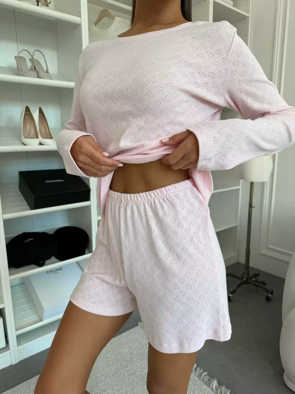 Комплект лонгслів та шорти «Rose Amour» з трансферної рібани Ідеальне поєднання ніжності, комфорту та легкості для дому й відпочинку. Ніжно-рожевий відтінок у дрібних сердечках створює романтичний настрій, а витончений пробитий візерунок на тканині надає комплекту особливого шарму. Лонгслів із довгим рукавом дарує відчуття затишку, а легкі шорти з м’яким поясом забезпечують свободу рухів і комфорт у теплі дні. Матеріал — 100% бавовна (трансферна рібана): приємний до тіла, дихає й створює відчуття максимальної м’якості. Комплект «Rose Amour» — для романтичних моментів, ніжних вечорів і ранків, коли хочеться краси й комфорту водночас. Лонгслів: довжина- 60 см, рукав-62 см