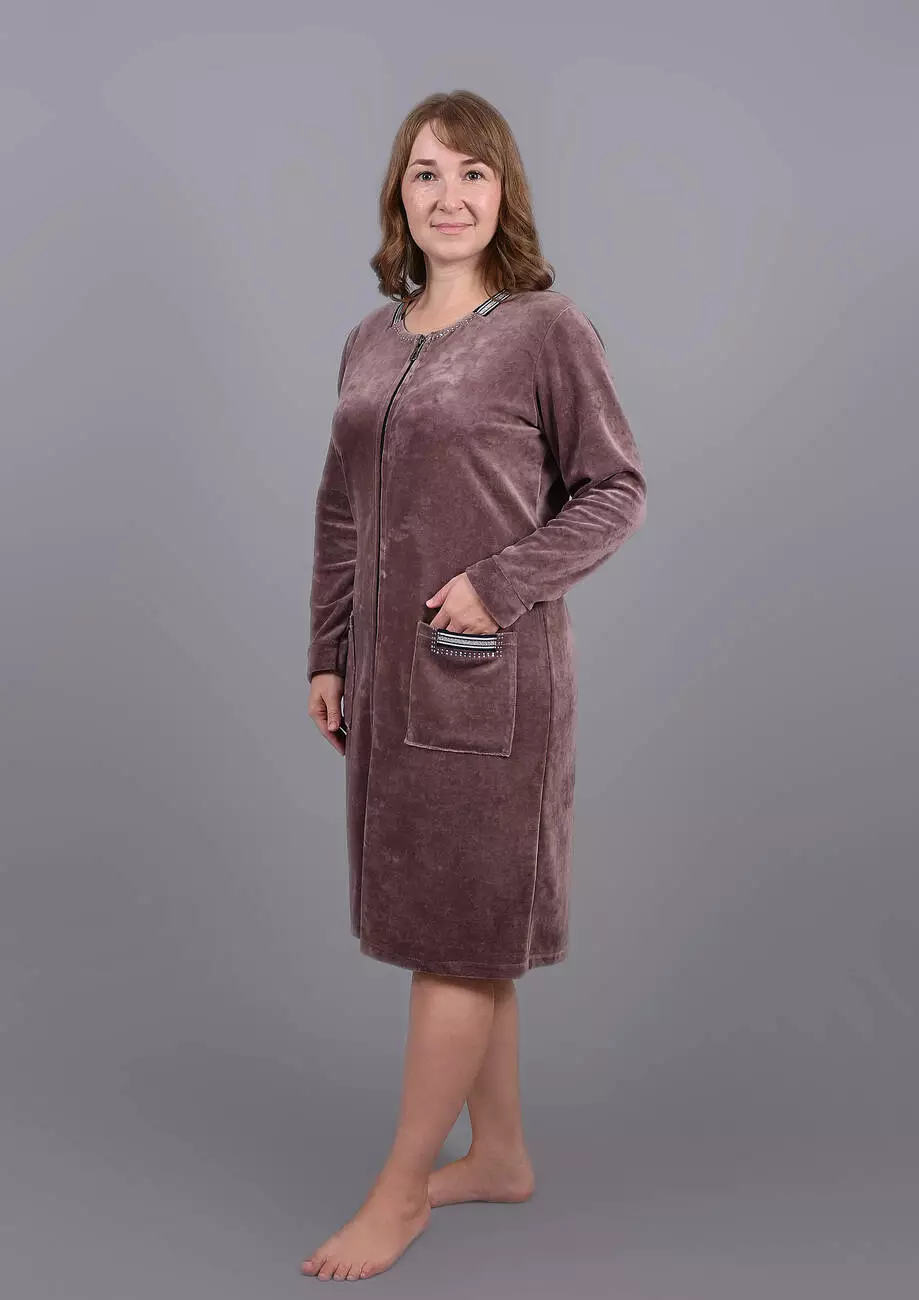 Модель халата однотонна, прикрашена зразами і накладними кишенями. Халат на блискавці.