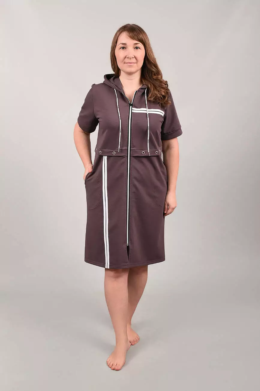 Виготовлений із трикотажного бавовняного велюру. Модель халата з капюшоном та бічними кишенями.
