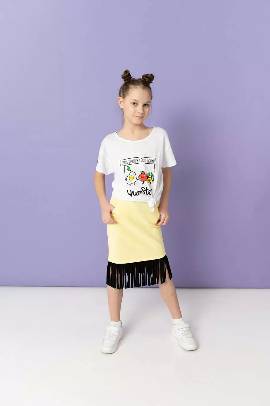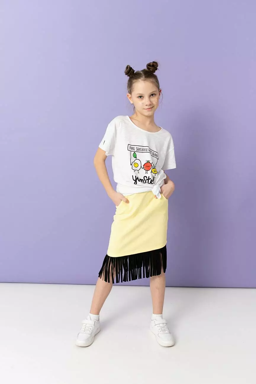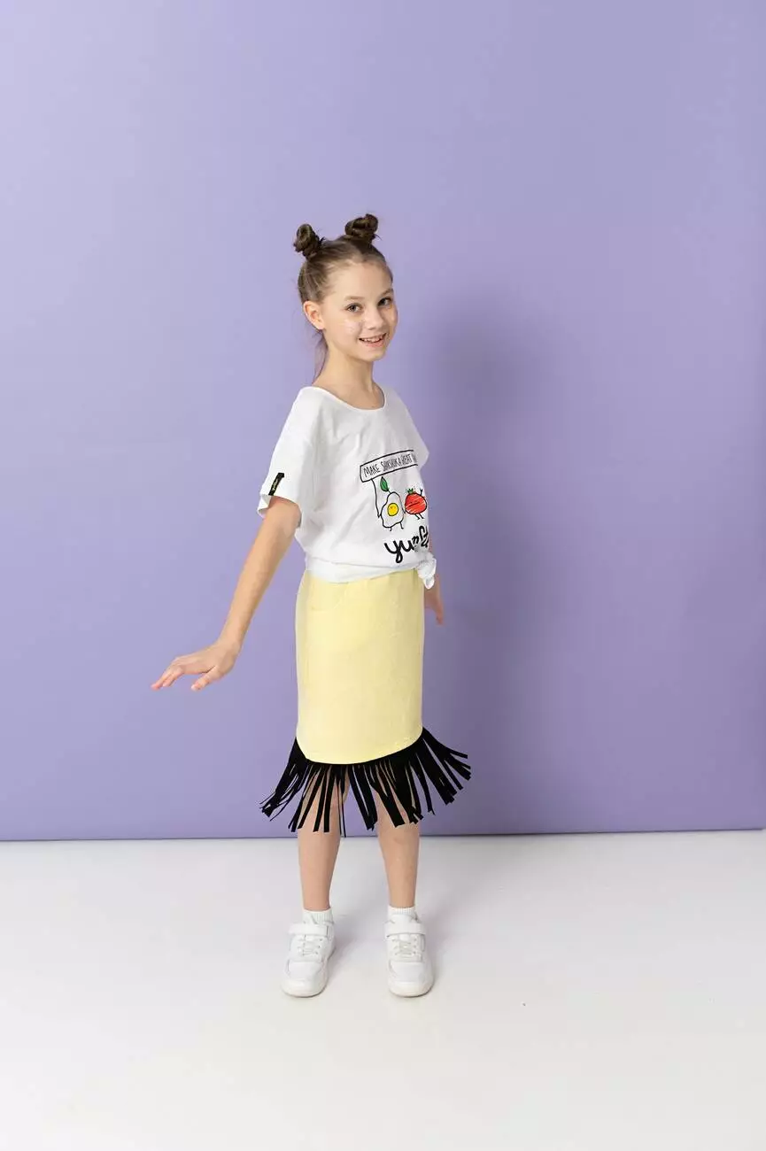 Трикотажна жовта спідниця з бахромою. Для дівчаток від 5 до 15