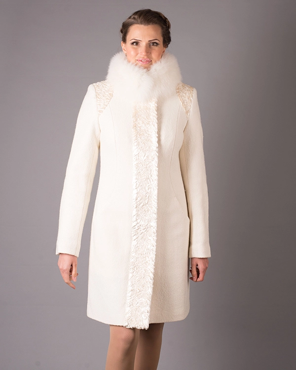 Зимнее пальто с оторочкой, по всей длине затежки, из меха искусственого каракуля с паетками. Ворот стойка, со съемным мехом натурального крашенного втон пальто песца. В наличии черный и белый цвета.  дЛина изделия - 95 см. Два прорезных кармана, подкладка - акрил, застежка - пуговицы. Размерный ряд модели - 42-52.