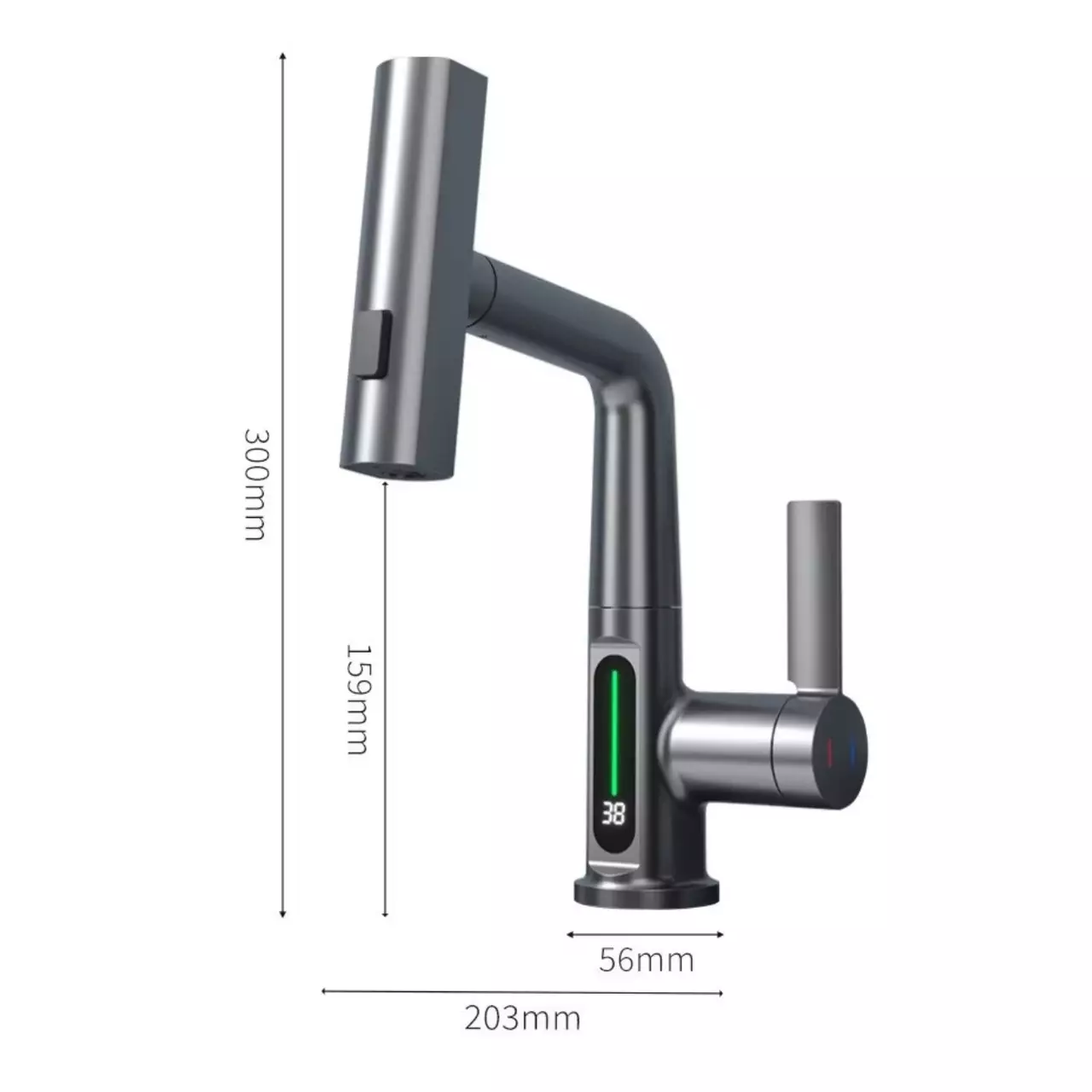 Змішувач оснащений висувним виливом, завдяки чому регулюється по