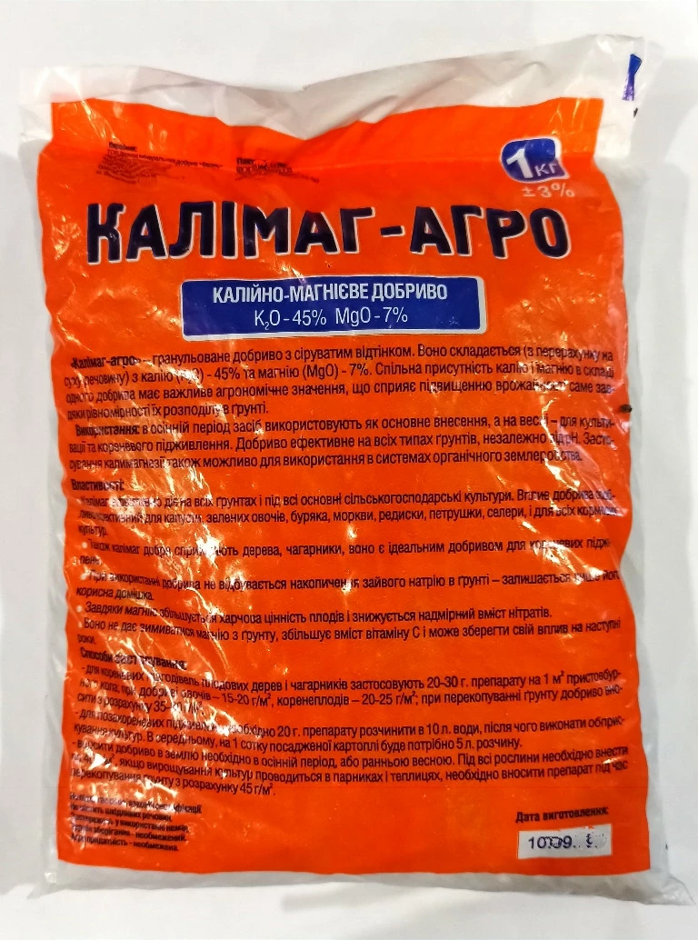 Калийное удобрение Калимаг (1 кг) – гранулированое удобрение с сероватым оттенком.