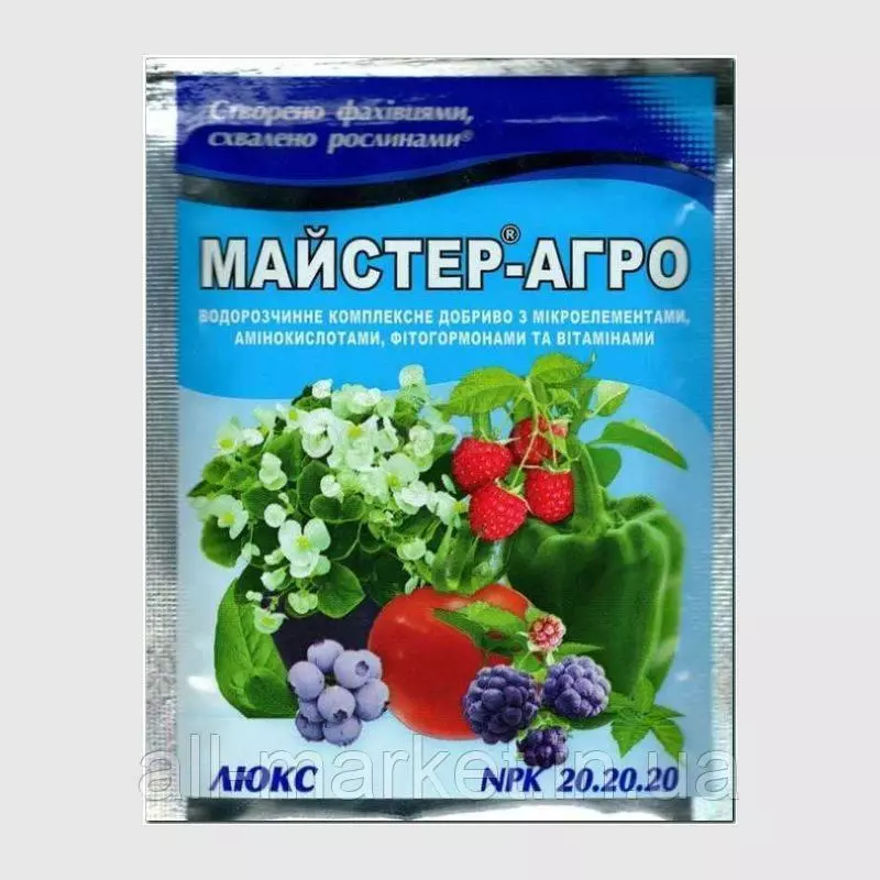 Мастер-Агро ЛЮКС NPK 20.20.20 — высокоэффективное комплексное удобрение с микроэлементами, витаминами, аминокислотами и фитогормонами. Применяется для подкормки большинства садовых и огородных культур. Не содержит хлор и отлично растворяется в воде. Используется в качестве раствора для полива рассады, овощей, винограда и цветов. Благодаря хелатной форме микроэлементов и полной растворимости в воде, быстро проникает через корневую систему и насыщает растение необходимыми питательными веществами.