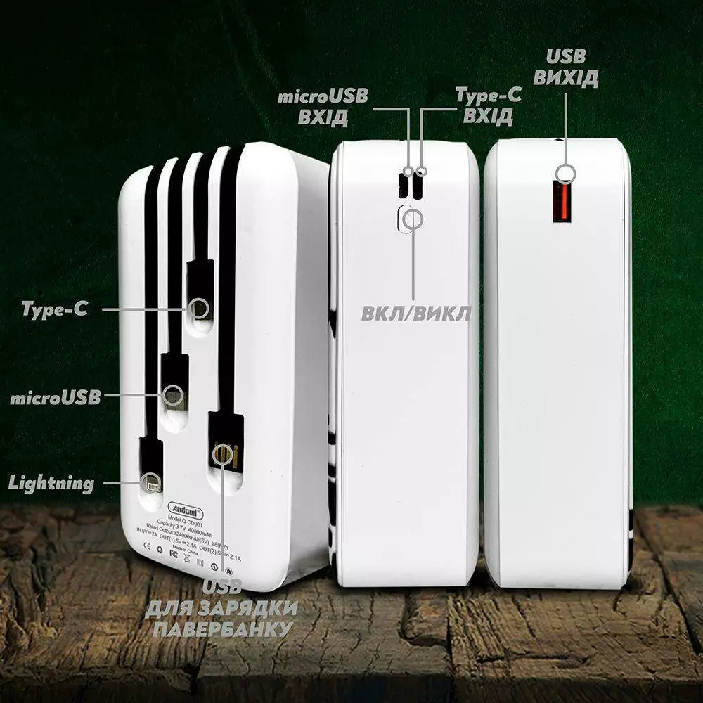 Портативная батарея Andowl Q-CD901 отличается стильным дизайном, высокой емкостью батареи и возможностью подключения нескольких устройств. Универсальная мобильная батарея Andowl Q-CD901 емкостью 40000 mAh совместима со всеми современными смартфонами и планшетами. Также УМБ Andowl Q-CD901  располагает наличием встроенных кабелей microUSB, USB Type C, USB Type A и Lightning с тыльной стороны устройства.