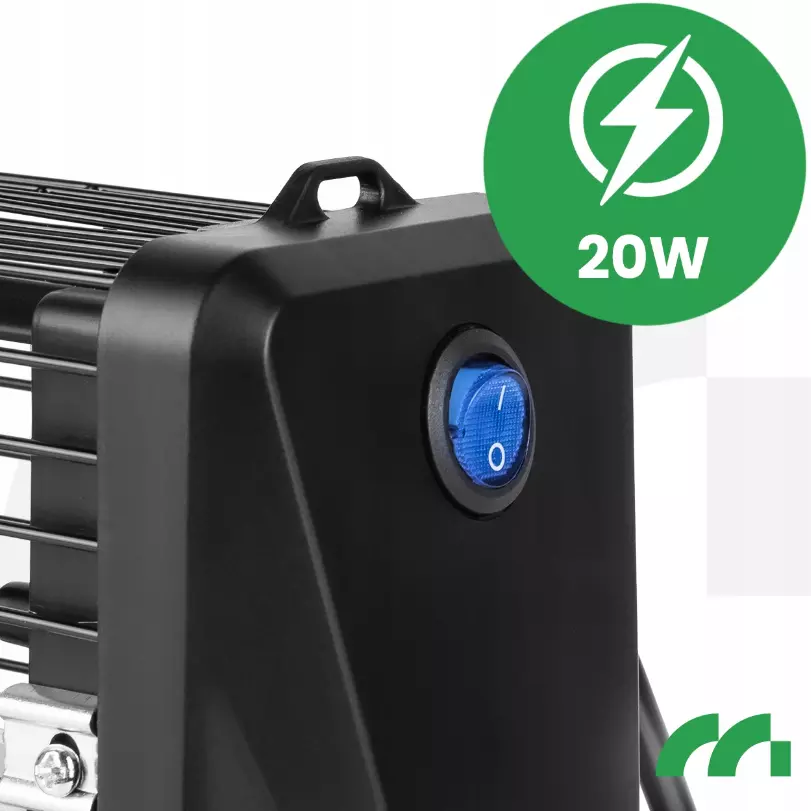 Лампа работает простым и эффективным способом. Она излучает ультрафиолетовый свет, который привлекает летающих насекомых, таких как мухи, мотыльки или комары. Насекомые, привлеченные флуоресцентными трубками (2х10 Вт УФ), попадают на высоковольтную сетку 3800 В, где их убивает током.