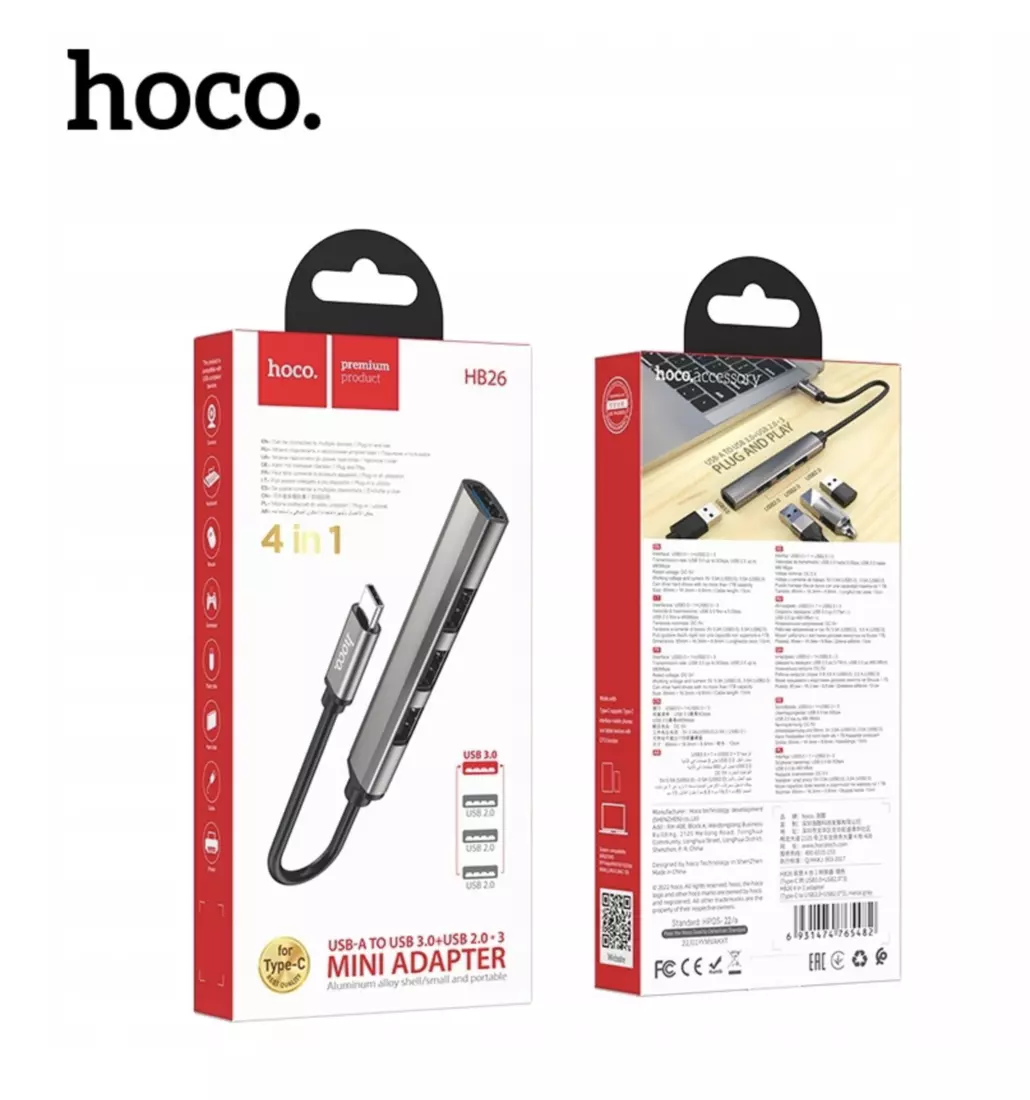 USB HUB HOCO HB26 4 in 1 Type-C to USB 3.0 + USB 2.0х3 Розгалужувач для ноутбука Сталевий