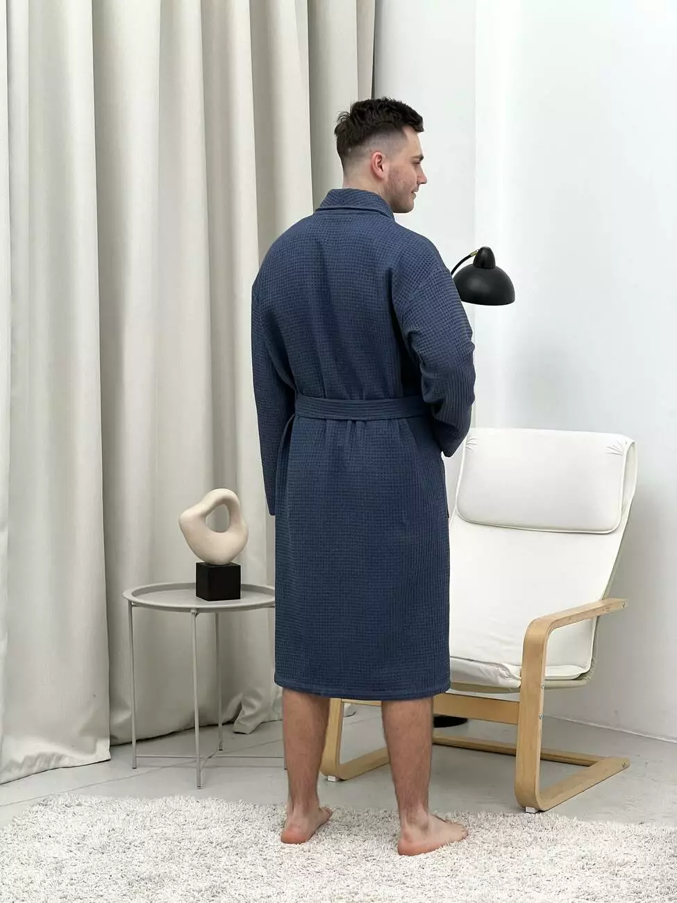 Халат виконаний із високоякісної вафельної тканини зі 100% турецької бавовни. Натуральний матеріал чудово пропускає повітря, дозволяє шкірі «дихати», добре вбирає вологу та не викликає дискомфорту навіть при тривалому носінні. Вафельна структура створює легкий масажний ефект і робить виріб особливо приємним до тіла.