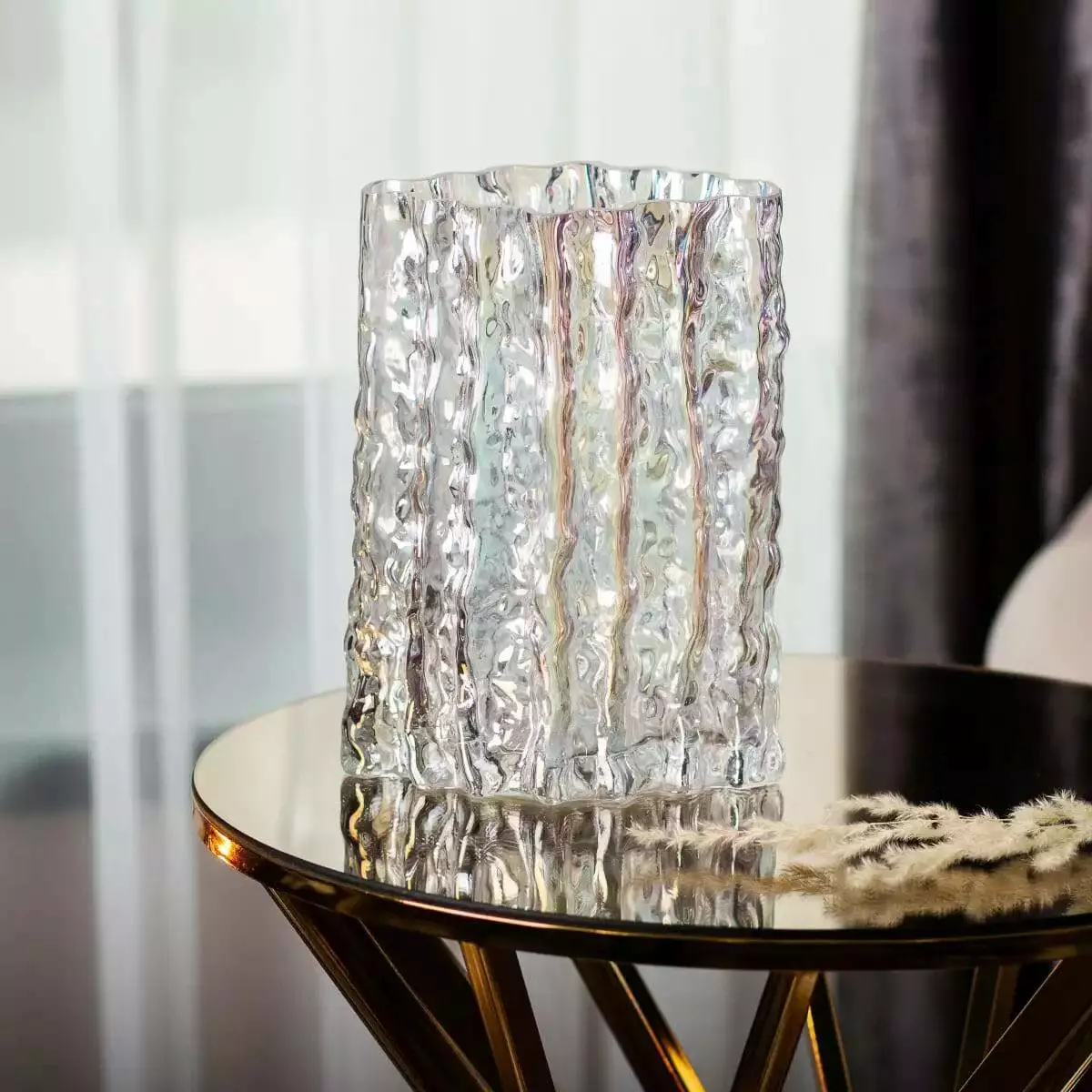 Ваза для квітів Crystal — розкішна скляна ваза під кришталь, створена у сучасному стилі, що вражає своєю витонченістю та багатогранним дизайном. Ваза має квадратну форму та ефектне покриття Rainbow, яке переливається різними відтінками залежно від освітлення. Це надає вазі неповторного шарму та робить її ідеальним акцентом у сучасному інтер'єрі.