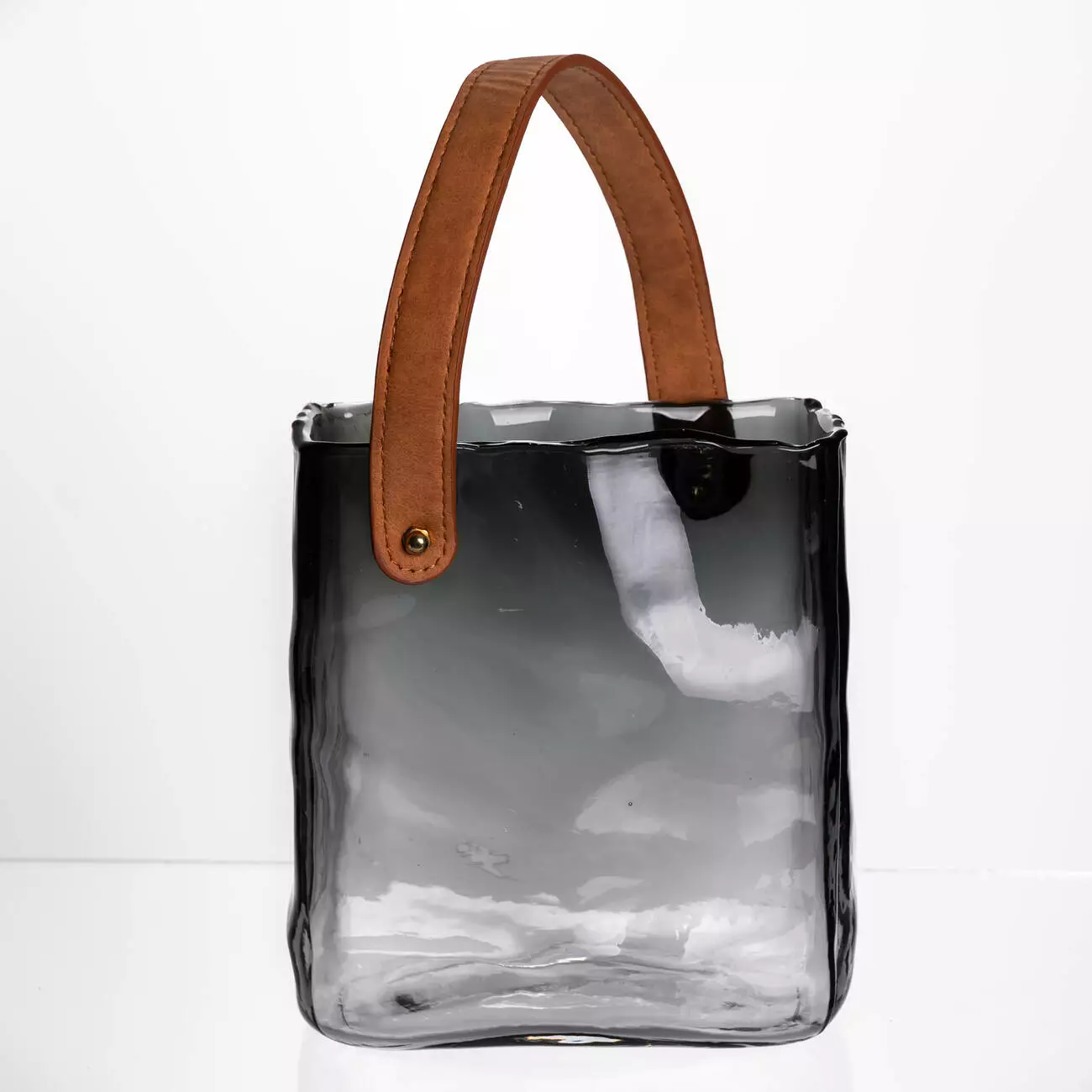Ця стильна ваза поєднує у собі простоту форм та виразну фактуру: товстостінне скло плавно згинається, створюючи м'які хвилі та гру світла. Невеликі нерівності та легка асиметрія підкреслюють ефект ручної роботи, роблячи вазу унікальною. Декоративна ручка з екошкіри додає теплоти та натуральної фактури, дозволяє легко переміщати виріб та використовувати його як акцентну деталь в інтер'єрі.