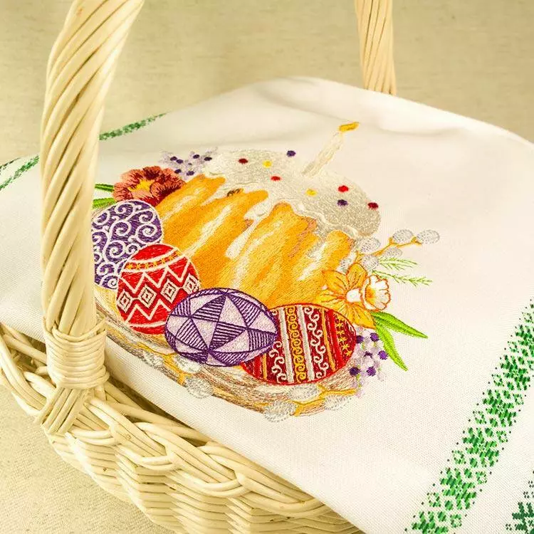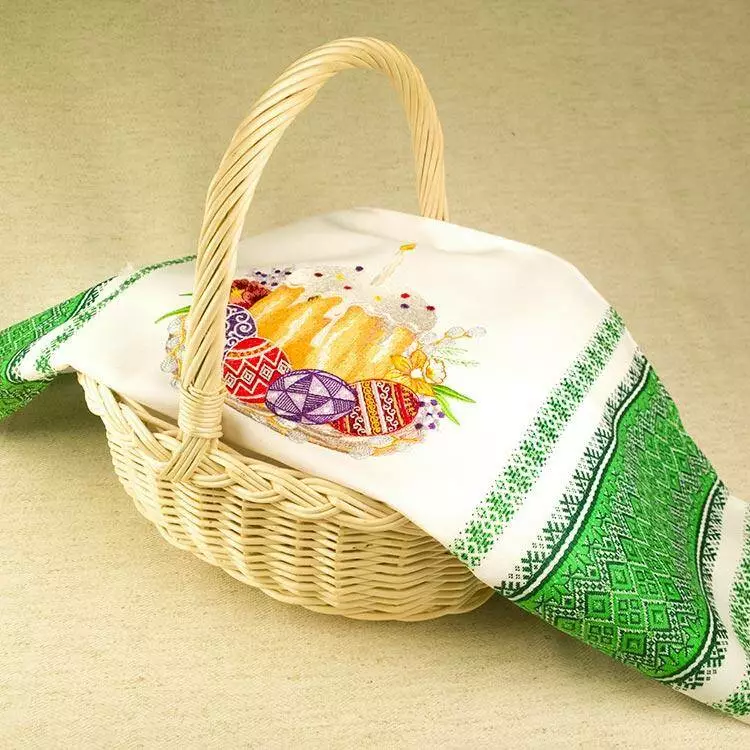 Нарциси, примули та верба – весняні провісники щорічного оновлення природи. Традиційні писанки та дряпанки, ароматна паска з запаленою свічкою – життя триває! Виконана в техніці «гладь» барвиста вишивка на фоні білосніжного тканого (не «мальованого») рушника прикрасить ваш пасхальний кошик та стіл.