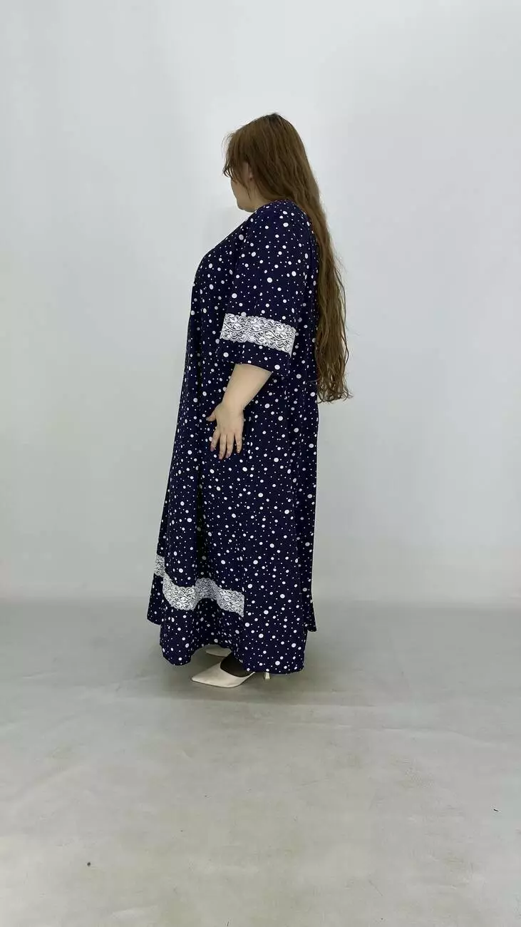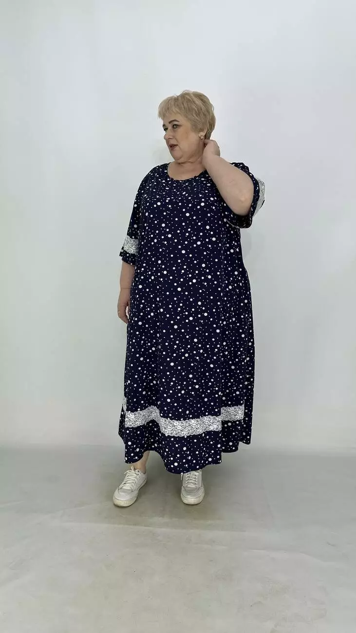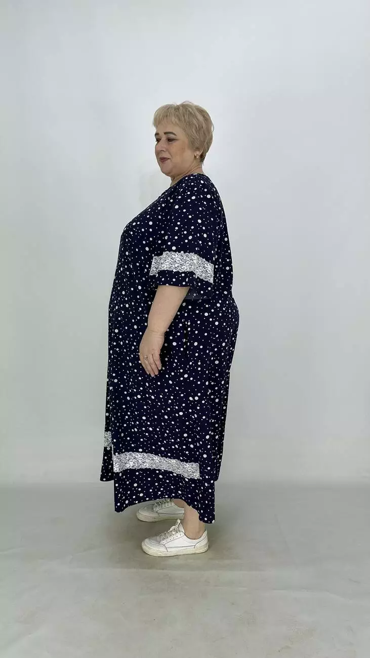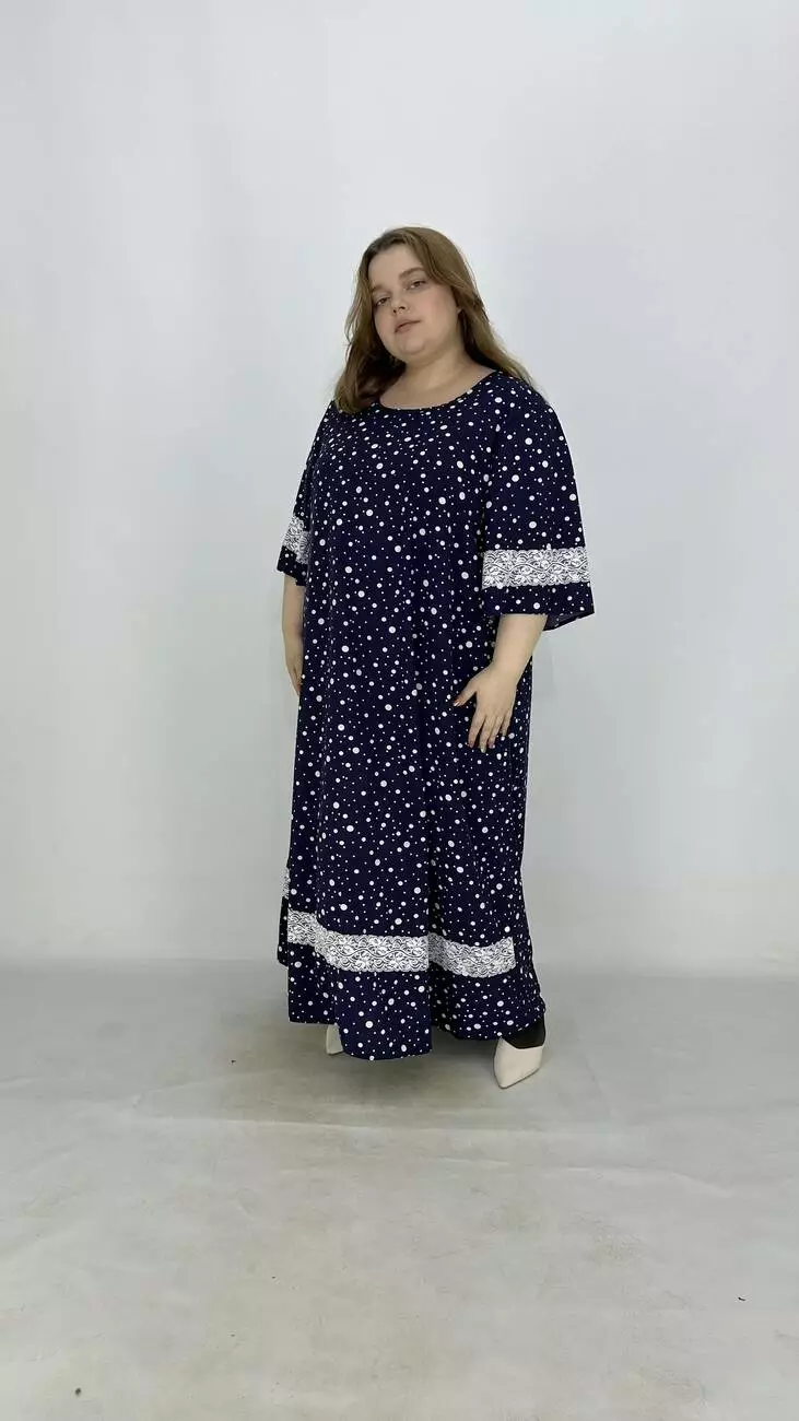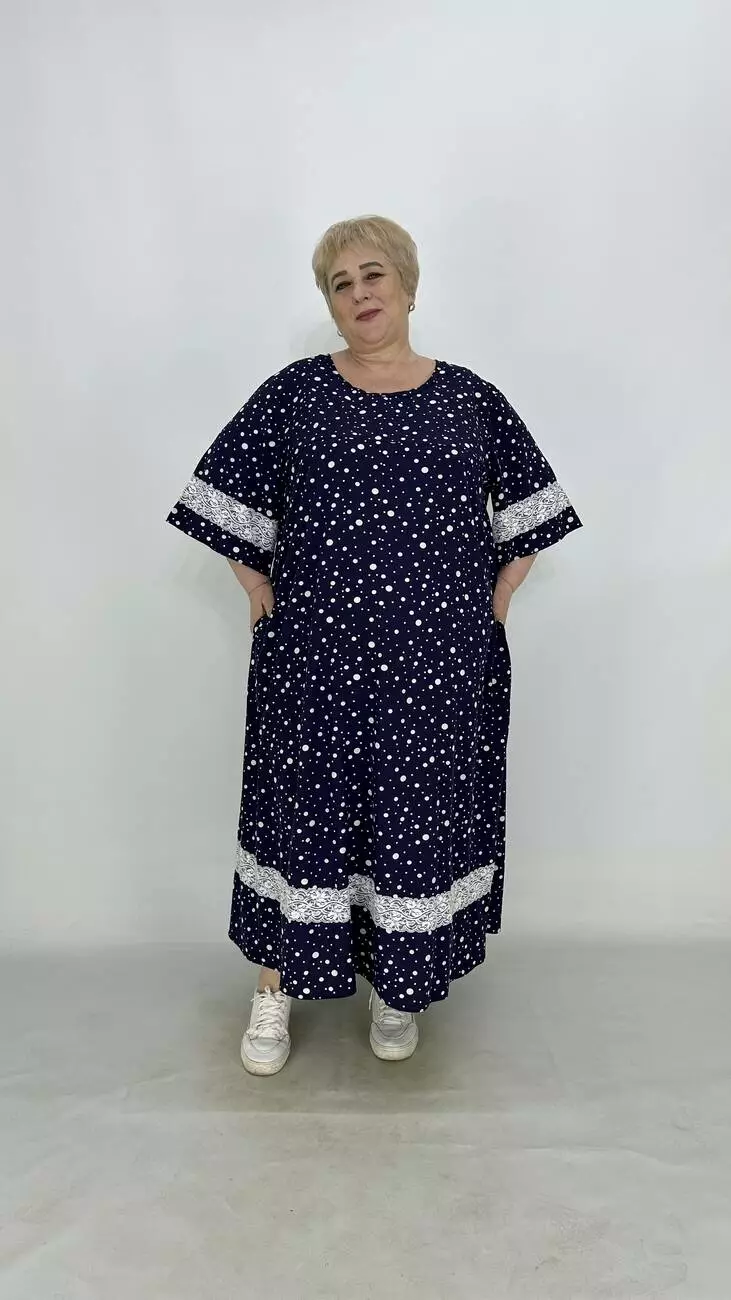 Свободное платье из супер софта, ткань лёгкая, мягкая, не мнется, растяжимости нет. А-образный силует, карманы в боковых швах. Платье украшено кружевом, рукав расширен.
